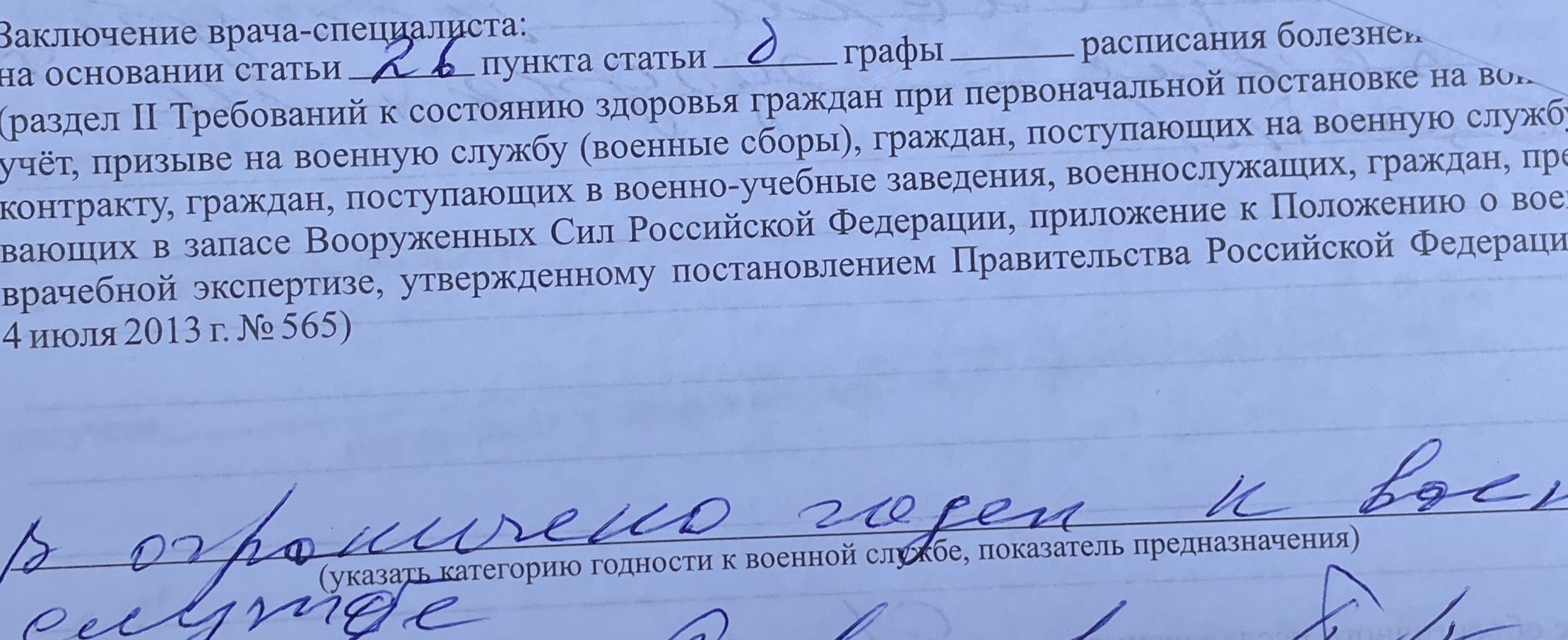 Mrwizard901 писал(а):Добрый вечер, побыл в военкомате сегодня, окулист отправил на обследование, поэтому не смог пройти всех врачей, дали повторную повестку на 18 октября, но невролог поставил категорию В, 26 статья пункт б