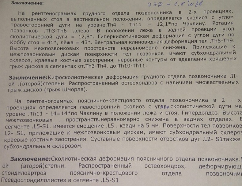 Представленное заключение свидетельствуют о наличии заболеваний позвоночника: сколиоз 2 степени, спондилоартроз, грыжи дисков. Также имеются рентгенологические признаки, свидетельствующие о незначительном нарушении функций.