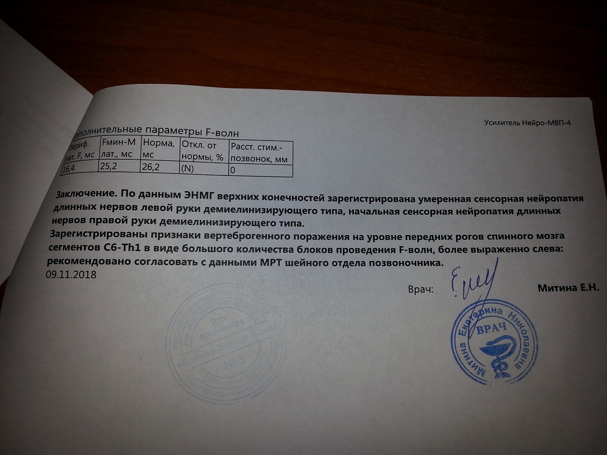 По данным ЭНМГ верхних конечностей зарегистрирована умеренная сенсорная нейропатия длинных нервов левой руки демиелинизирующего типа, начальная сенсорная нейропатия длинных нервов правой руки демиелинизирующего типа.