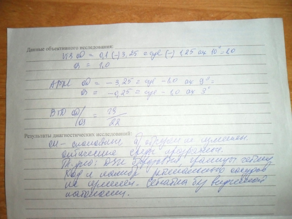 Представленные результаты обследований, свидетельствуют о наличии миопии средней степени с астигматизмом. Также в представленном заключении содержится информация с результатами исследования остроты зрения.
