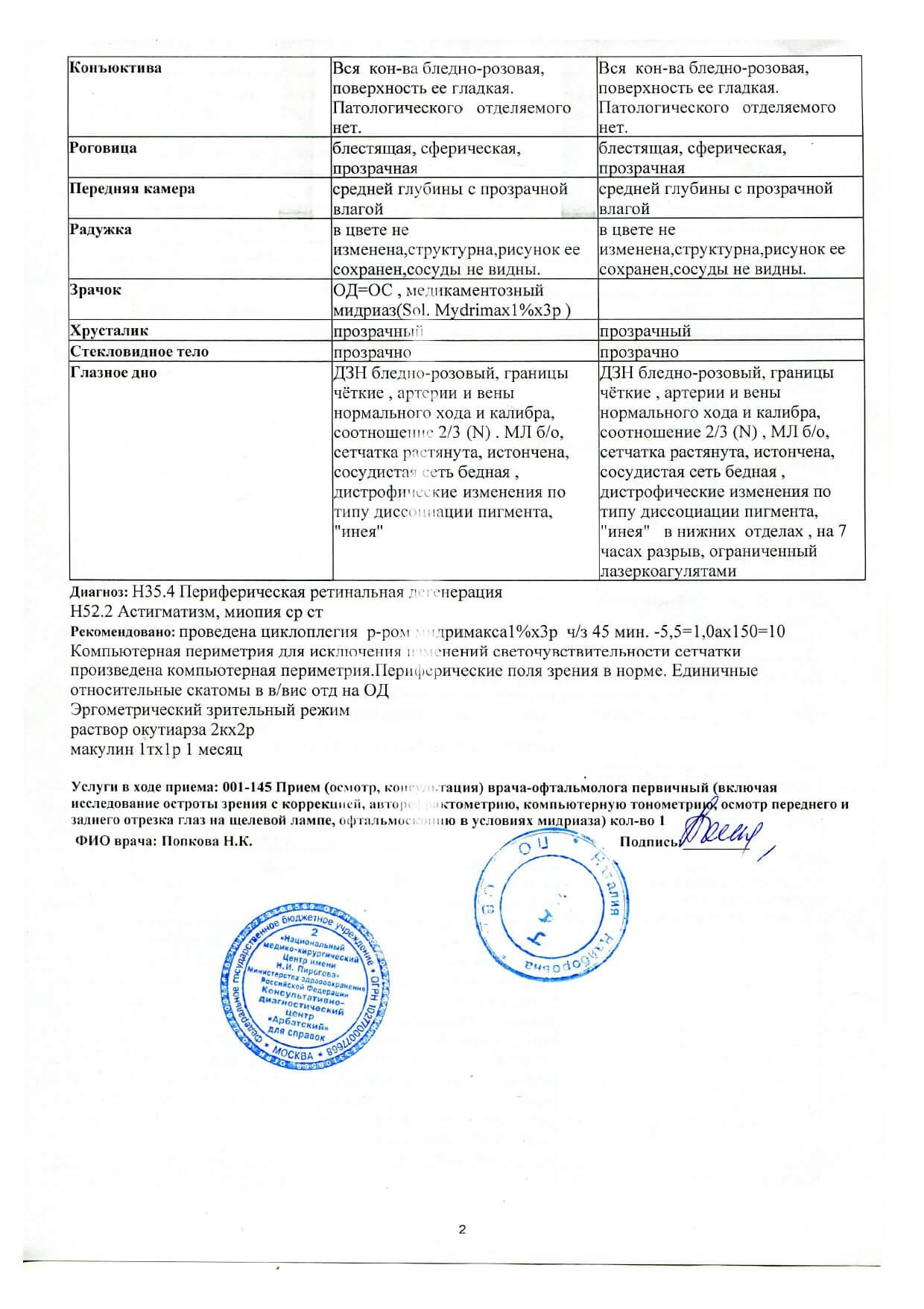 В 2019 году офтальмолог поставил мне диагноз Периферическая ретинальная дегенерация H35.4. Скан заключения прикладываю. По состоянию на декабрь 2019: