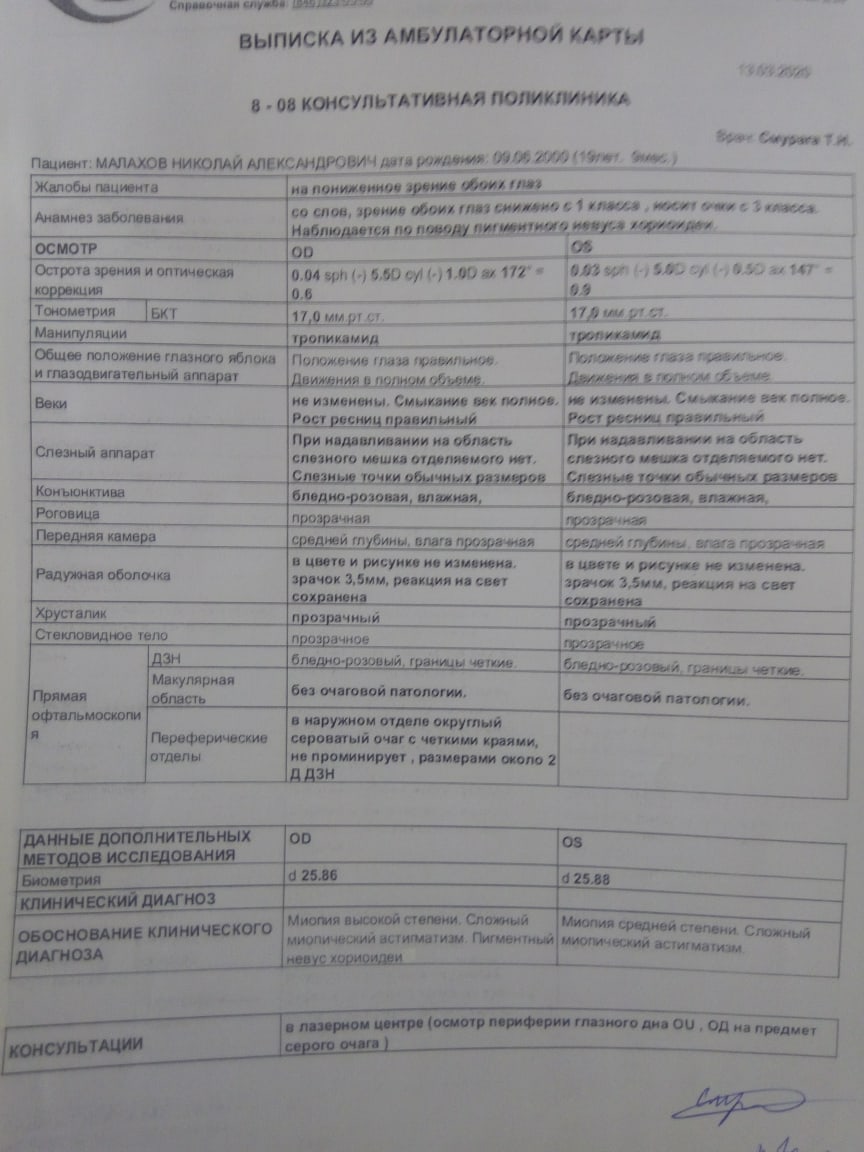 В представленной выписке содержится информация о наличии миопии высокой степени правого глаза с астигматизмом. В Вашем случае, миопия правого глаза на одном из меридианов более 6.00 дптр, что является основанием для применения пункта «в» статьи 34 Расписания болезней.