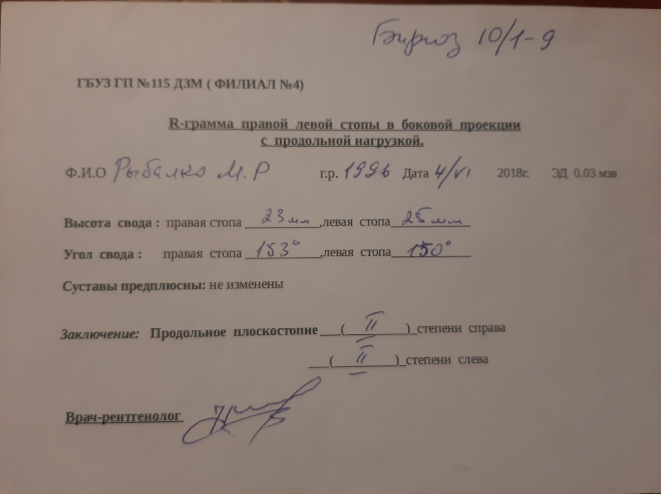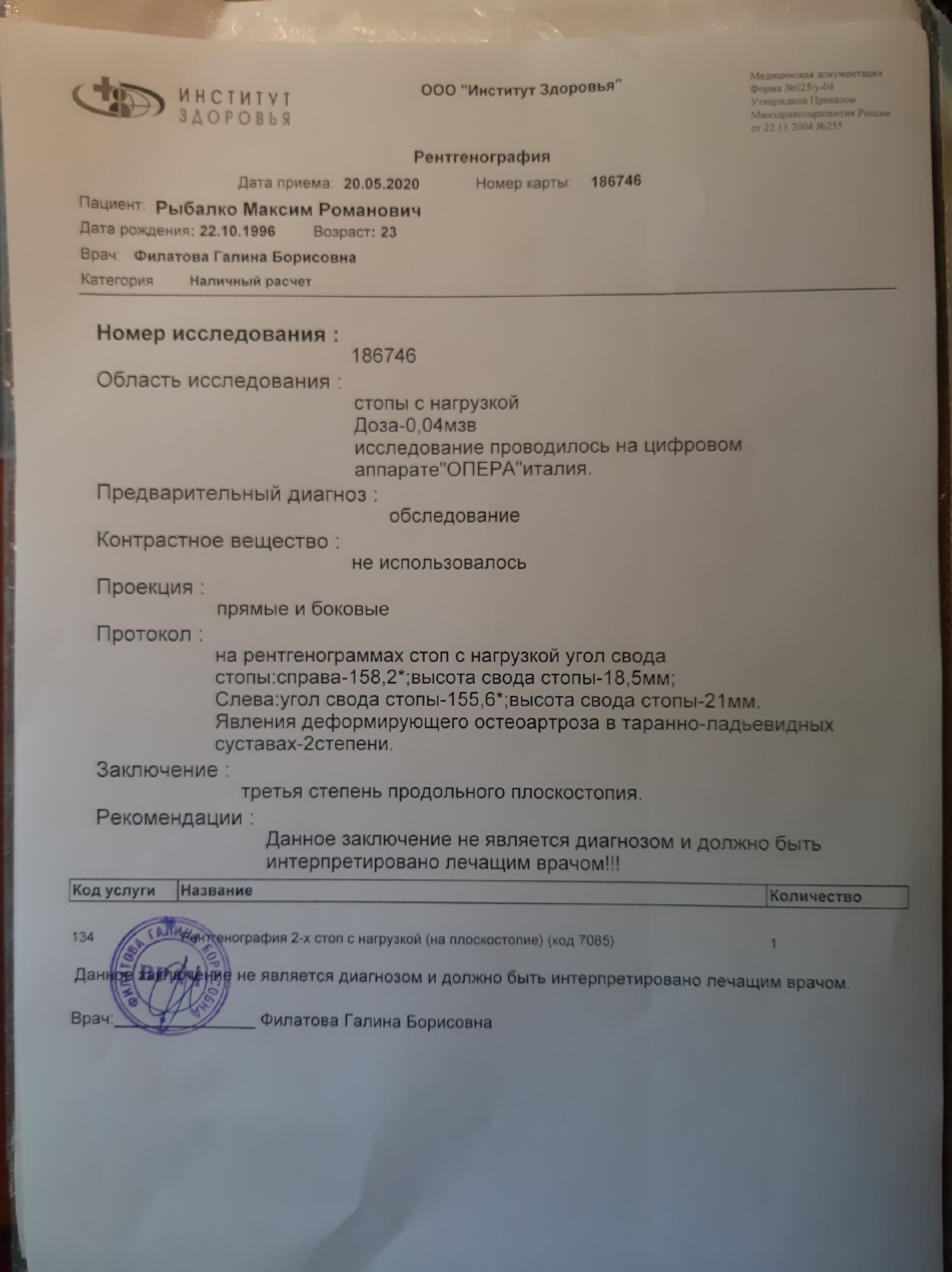 Добрый день, имею проблемы с ногами, а именно плоскостопие. При относительно небольшом стоянии на месте, сильно начинают уставать ноги, болеть в коленях и т.д. Поэтому всячески стараюсь избегать стоячей работы. При ходьбе ситуация лучше, но если долго ходить, то ноги также устают и побаливают. в 2018 году делал в своей поликлинике рентген, написали 2 степень продольного плоскостопия. Есть такое заключение (см. фото). В мае этого года в связи с пандемией рентген в поликлинике мне не сделали и я обратился в частную. Заключение в частной указала на 3 степень (см. фото). В конце августа обратившись к хирургу с намерением сделать снимок в своей поликлинике мне сказали, что нет смысла делать снимок (облучать лишний раз) так как с этим заключением меня должны будут отправить на обследование к поликлинику по реестру.