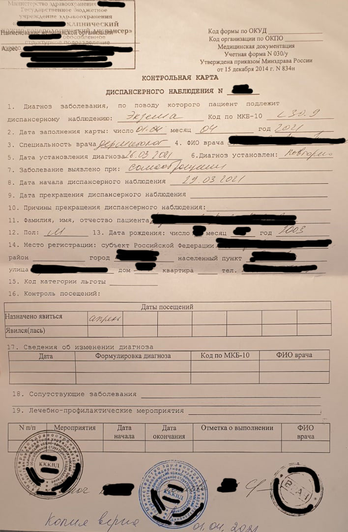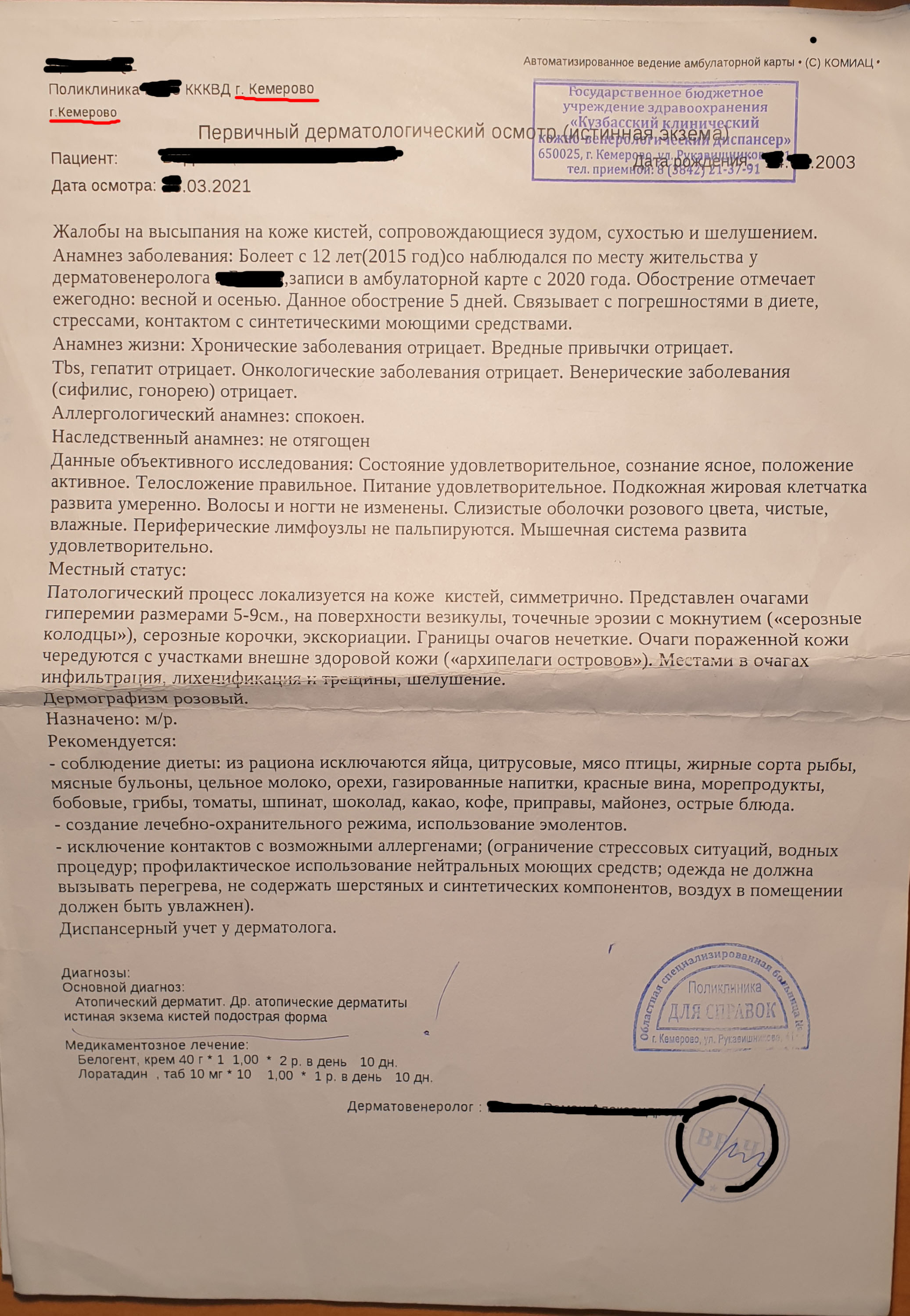 Здравствуйте, мне 18 лет, у меня диагноз: экзема кистей рук. Я наблюдаюсь в городском КВД с января 2020, и в амбулаторной карте был записан данный диагноз кжадое посещение (итого около 5-6 записей с таким диагнозом). Болезнь у меня обостряется только с ноября по апрель, в остальное время руки нормальные (как и сейчас). 2 недели назад я попал на медкомиссию в военкомат, где увидев записи в амбулаторной карте об экземе мне дали акты и отправили в КВД. В общем, я съездил в областной центр (областной КВД), где врач мне поставил диагноз: истинная экзема кистей подострая форма, атопический дерматит (картинка номер 1), с этим документом я отправился в городской КВД, где мне написали акты и т.д. Но вот в чем проблема, в военкомате, когда я принес акты, сказали, что нужно сдать некий гистологический анализ, так же я обратил внимание, что на документах, предназначенных для военкомата от городского КВД (картинка 2), в самом низу в поле "Диагнозы острые" ничего не написано. Так же прикрепляю ещё один документ для военкомата от КВД (картинка 3)