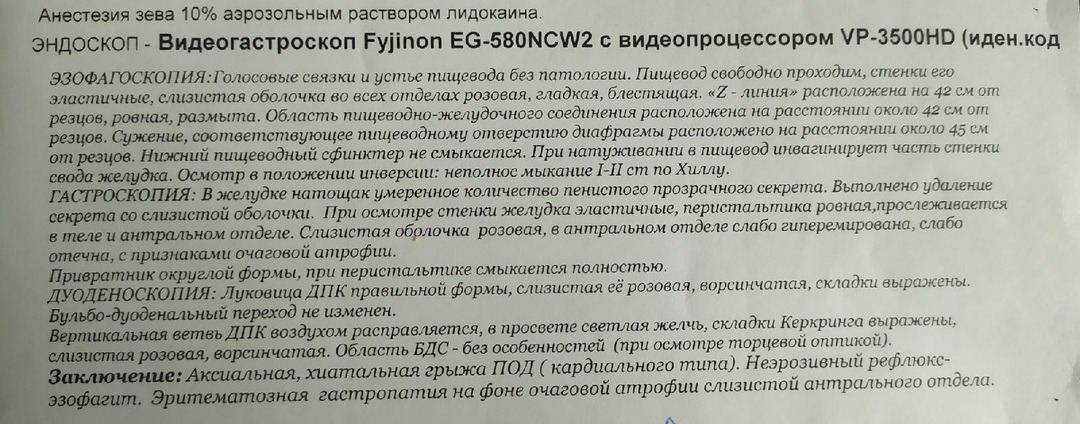 Заключение эндоскопии не является диагнозом. Чтобы получить диагноз - вам нужно посетить гастроэнтеролога. В частности гастроэнтеролог должен указать степень аксиальной хиатальной грыжи ГОП, степень рефлюкс-эзофагита и частоту его рецидивов.
