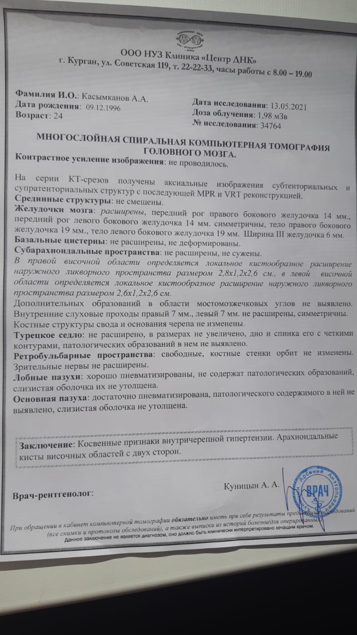 "Косвенные признаки внутричерепной гипертензии. Арахноидальные кисты височных областей с двух сторон"
