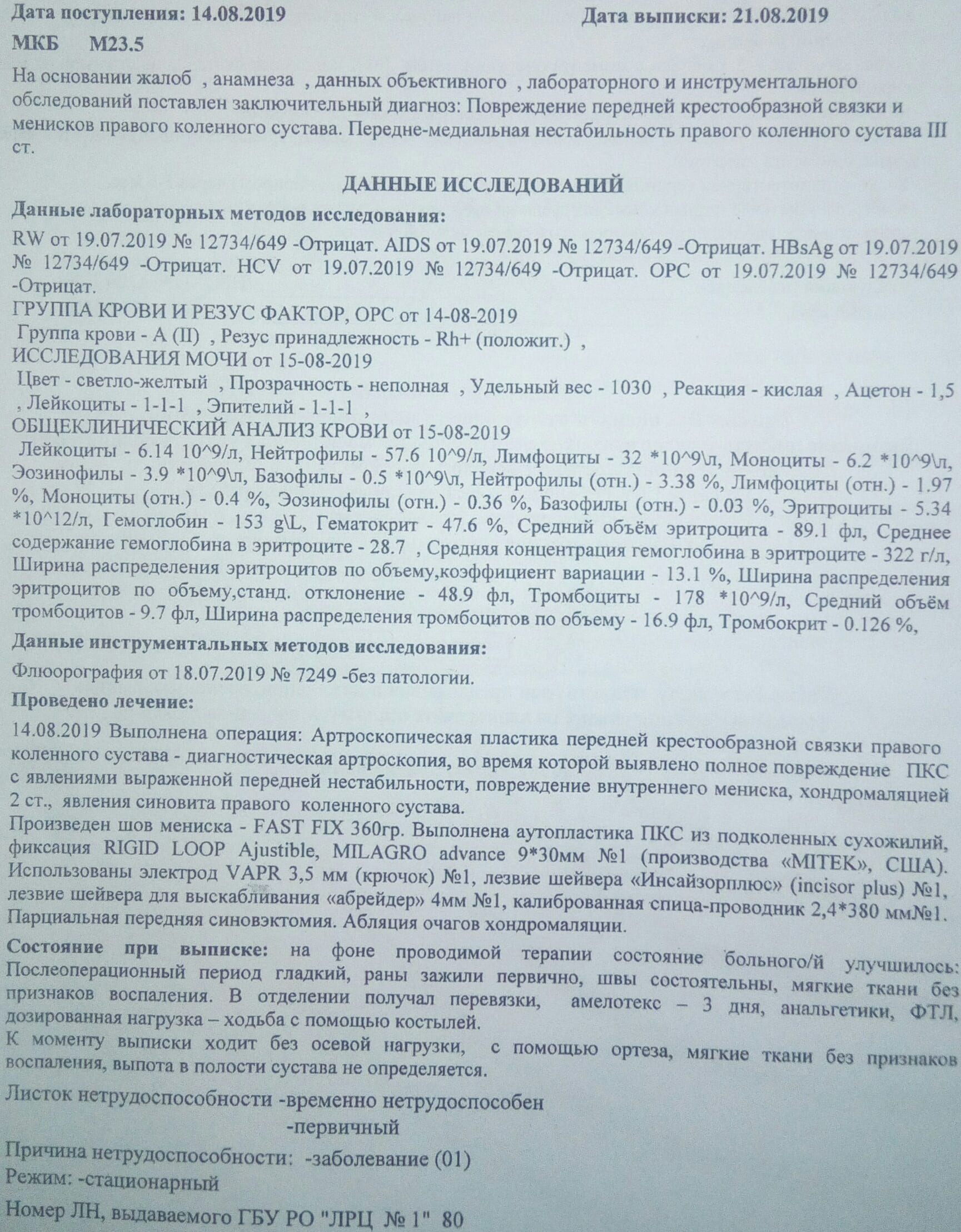 Был разрыв ПКС и заднего рога медиального мениска и хондромаляция. Произвели пластику ПКС и шов мениска. До операции была сильная нестабильность. Из документов есть МРТ, которые было произведено до операции и выписка с места, где делали операцию.