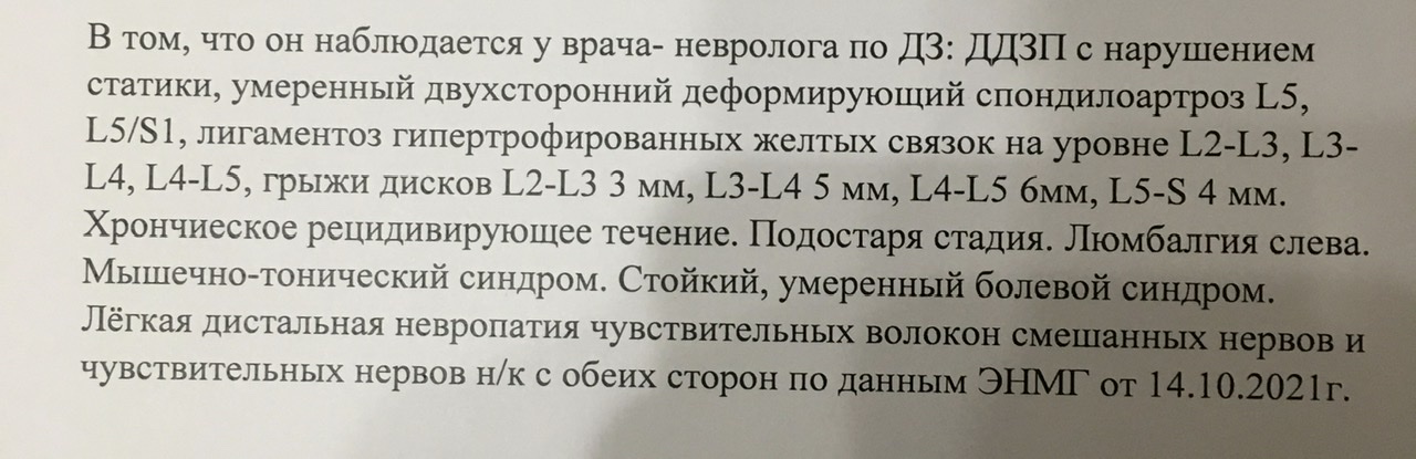 DmitryS писал(а):Aleksey95 писал(а):DmitryS писал(а):В полном виде (а не только диагноз) фотографию заключения врача-невролога скиньте. А так же если есть заключения от врачей травматолога-ортопеда и нейрохирурга, то их тоже скиньте.
