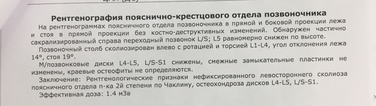 Заключение: сколиоз поясничного отдела позвоночника второй степени, остеохондроз поясничного отдела первой степени.