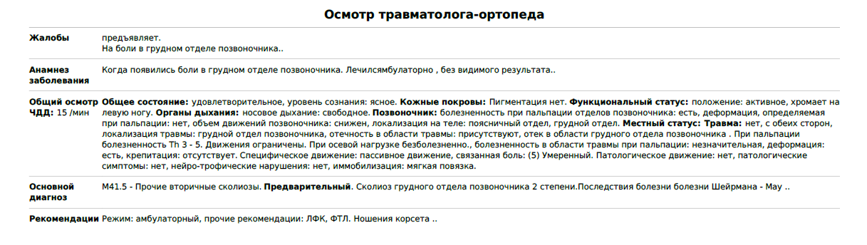 Спасибо за ответ. Как я понял фраза "нарушение функций" обязательно должна фигурировать в заключении (в диагнозе). А не подскажите, понимаются ли под нарушением функций формулировки ортопеда из графы "общий осмотр" : "Функциональный статус: положение: активное, хромает на левую ногу; Позвоночник: болезненность при пальпации отделов позвоночника: есть; объем движений позвоночника: снижен; локализация травмы: грудной отдел позвоночника, отечность в области травмы: присутствуют, отек в области грудного отдела позвоночника; При пальпации болезненность Th 3 - 5. Движения ограничены; Специфическое движение: пассивное движение, связанная боль: (5) Умеренный" ? И может ли врач с этими данными в заключении писать - сколиоз 2 ст. с нарушением статической функции, нарушением двигательной функции?