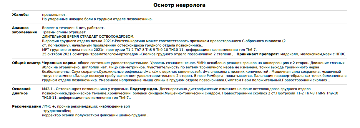 Невролог только дополнил в осмотре инф. про боли в спине, прием лекарств, ограничение движений в ГОП.