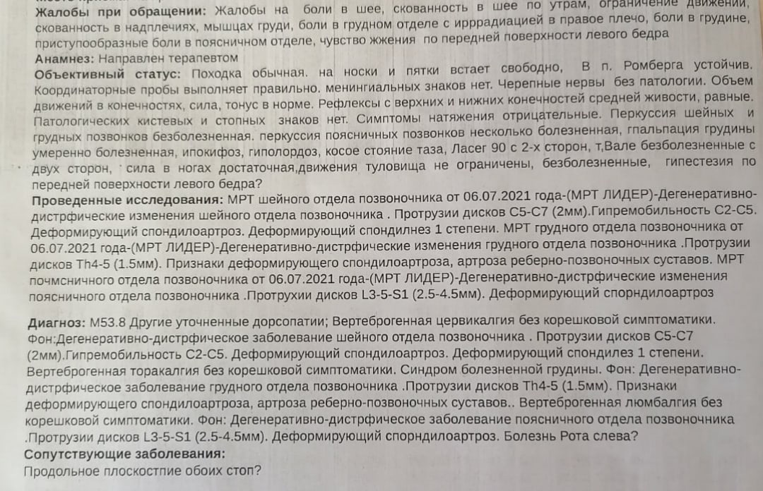 Все заключения неврологов НЕ отмечают радикулопатию, корешковую симптоматику, рефлексы в норме. Общий диагноз: Хроническая дорсалгия ( см. цервикалгии, см. торакалгии, см. люмбалгии)