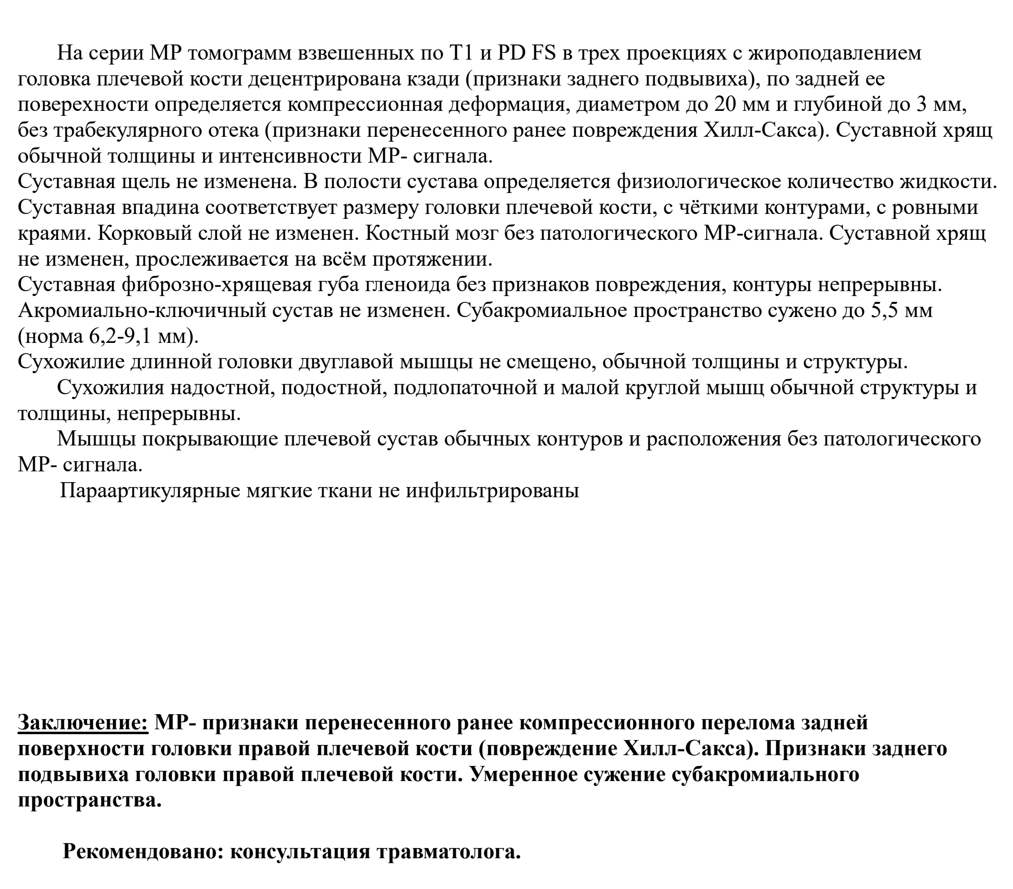 История долгая, с 2014 года после неудачного падения начались передние вывихи плеча. 2-3 вывиха в год, вправлялись обычно сами легко, обычно вывихи были при резком замахе. Говорил в военкомате об этом, они смотрели сквозь пальцы мол, нет доказательств, ничем не можем помочь. 5 месяцев назад, случился такой же вывих, только вправить я его сам не смог. Отправился в скорую, сделали рентген - вправление - рентген. На этот призыв я уже пришел с этим снимком и справкой от врача который вправлял. Отправили на консультацию к районному травматологу. Она отправила сначала на учи плечевого сустава, ничего там не нашли. Сейчас стою в очереди на мрт от районной больницы(военкомата). Отдельно для себя съездил в платную клинику и сделал МРТ заранее. Результаты на картинке. Скажите заочно на какую категорию годности могу претендовать (На руках два снимка до и после вправления, результат этого мрт и результат узи. Скоро будет ещё одно мрт и то бишь результат)?