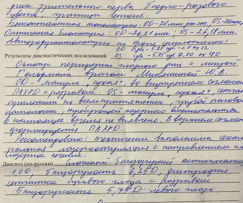Также завёл там амбулаторную карту и получил следующую выписку, где указана миопия средней степени