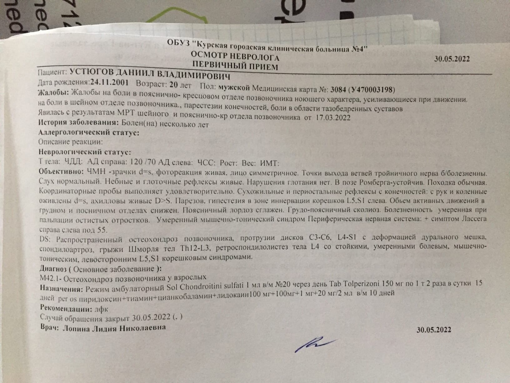Заключение травматолога-ортопеда: первичный остеоартроз шейного отдела позвонка, S-образный сколиоз шейного, грудного и пояснично крестцового отдела позвоночника 1 степени, ретроспондилолистез тела L4. Болевой синдром