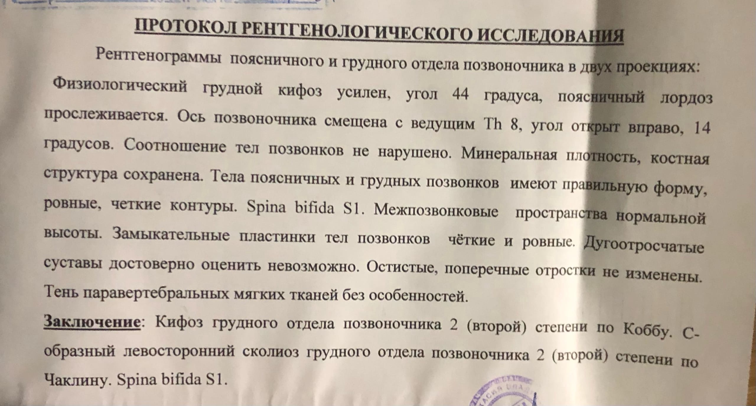 Поставили диагнозы: Кифоз грудного отдела позвоночника 2 степени , С - образный левосторонний сколиоз грудного отдела позвоночника 2 степени.