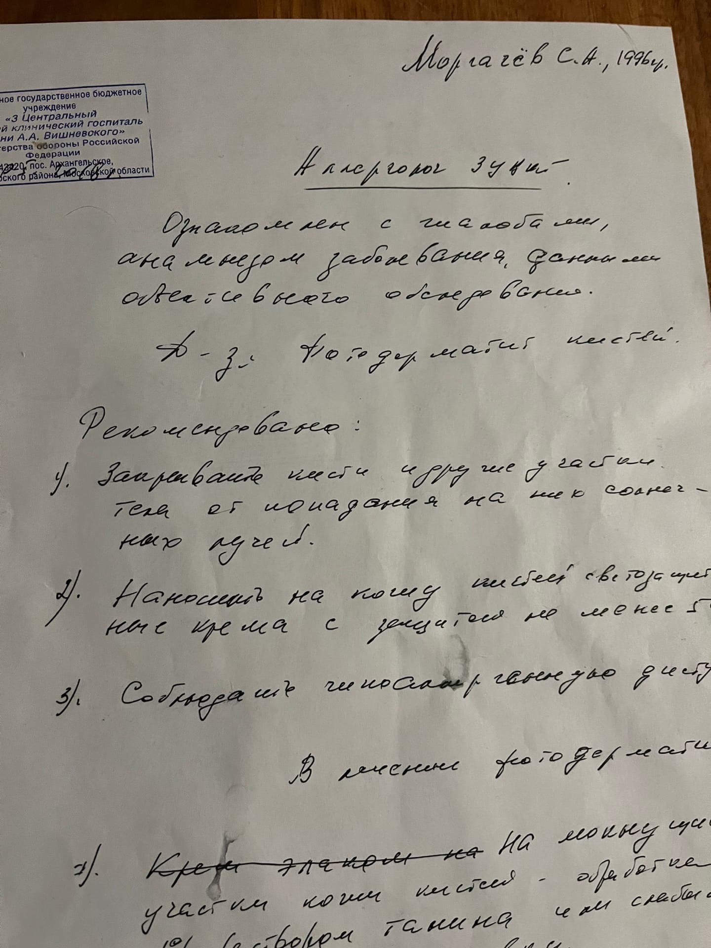 Так же в 2018 был у аллерголга в другой больнице написали фотодерматит кистей ( скрин)