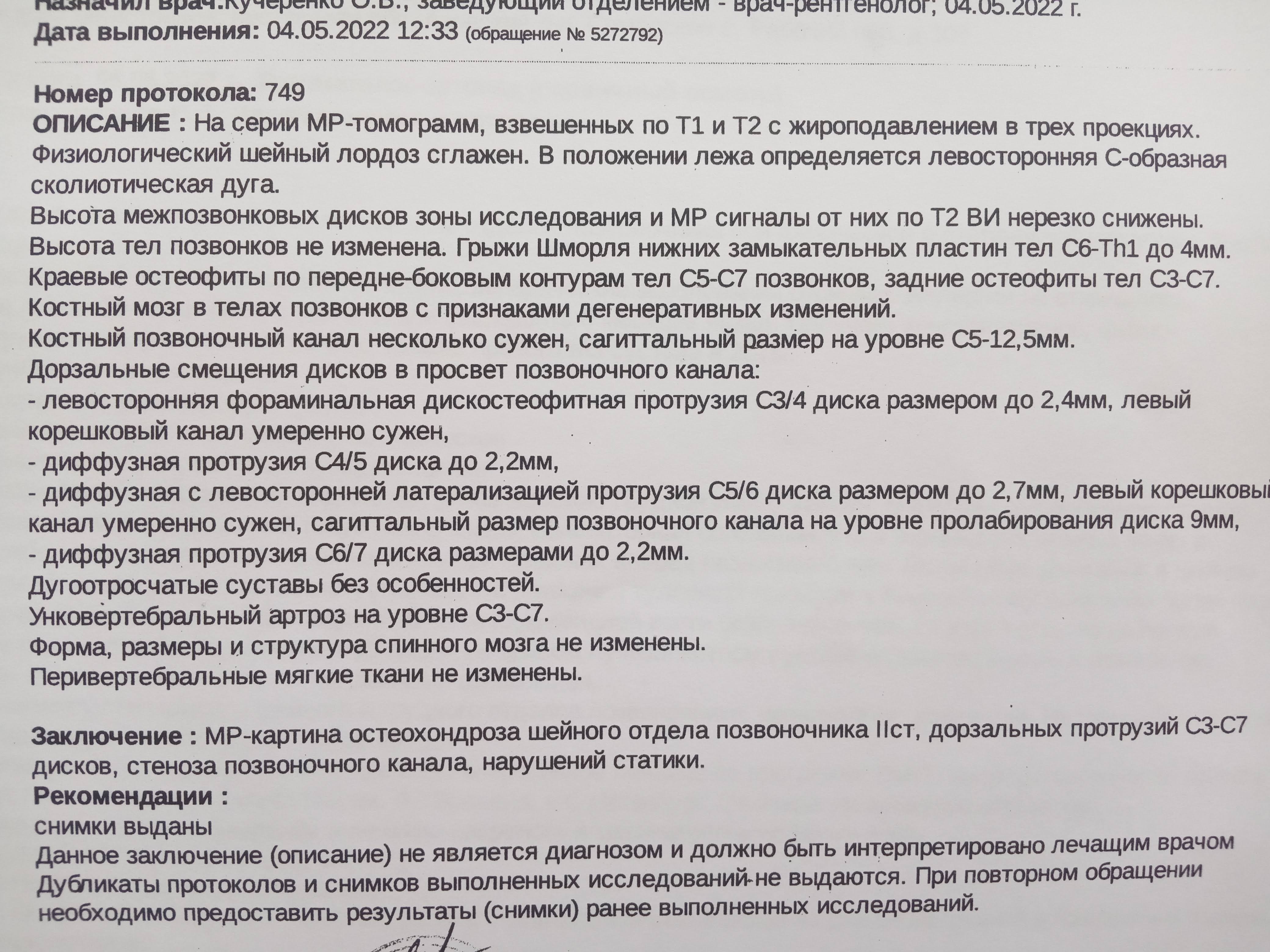2. Остеохондроз шейного отдела позвоночника. Обратился впервые. Результаты МРТ и осмотра травматолога-ортопеда прикладываю.