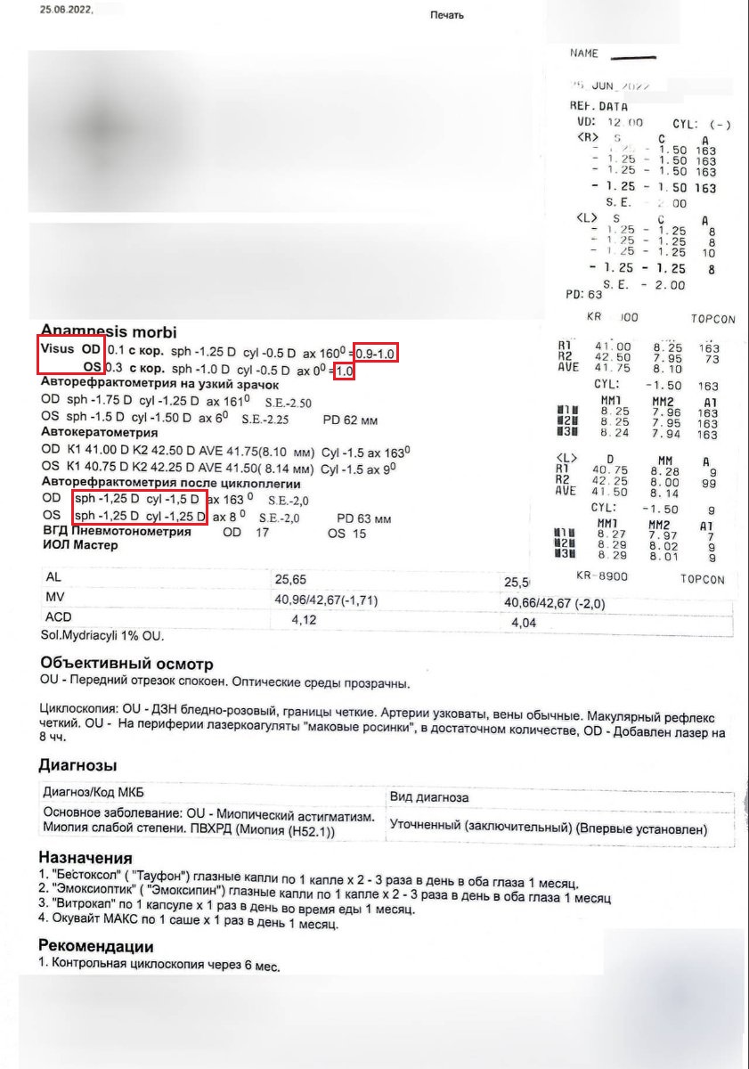 2. "Sph, cyl" - это близорукость и астигматизм. У вас близорукость и астигматизм на правом глазу в состоянии циклоплегии (широкий зрачок) равны -1,25 и -1,5, а на левом глазу -1,25 и -1,25, что соответствует призывной категории годности "А", так как согласно статье 34, пункту "в" российского Расписания болезней непризывная категория годности "В" присваивается если имеется: "Близорукость любого глаза на одном из меридианов более 6,0 дптр и до 8,0 дптр в состоянии циклоплегии", а согласно статье 34, пункту "б" российского Расписания болезней также непризывная категория годности "В" присваивается если имеется: "Близорукость любого глаза в одном из меридианов более 8,0 дптр и до 12,0 дптр либо астигматизм любого вида на любом глазу с разницей рефракции в двух главных меридианах более 4,0 дптр и до 6,0 дптр в состоянии циклоплегии".