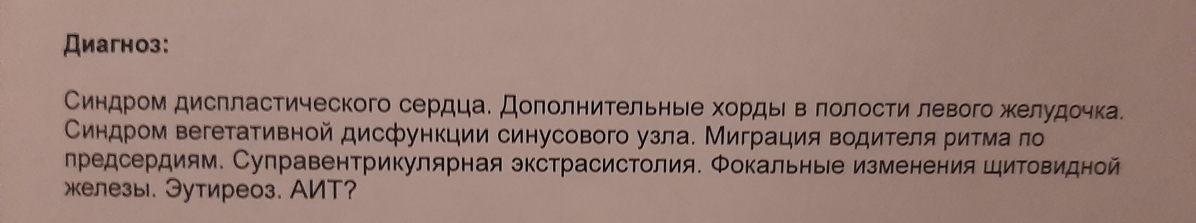 Синдром дисплатического сердца, дополнительные хорды в полости левого желудочка, синдром вегетативной дисфункции синусового узла, миграция водителя ритма по предсердиям, суправентрикулярная экстрасистолия
