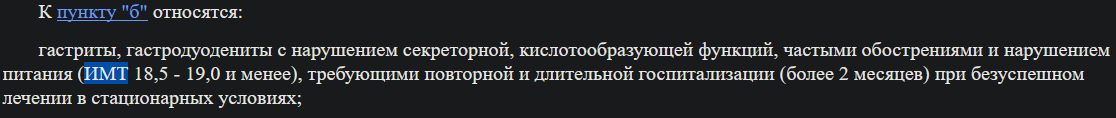 Надо_жить писал(а):Добрый день, у меня обнаружили гастрит в 16 лет, проявлялся постоянно, ходил на приёмы к гастроэнтерологу, он просто выписывал полисорб и всё, обследование проходил раза 2-3 за всё время, сейчас мне 19 и близится к концу обучение в колледже, думаю обследоваться повторно чтобы были свежие анализы, но так же у меня ИМТ +-17, рост 172, вес 51, могу ля рассчитывать на категорию "В" в военкомате?