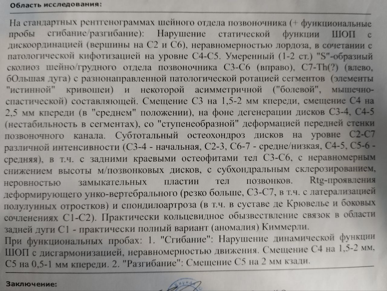 Добрый день, имею следующий диагноз по результатам рентгена с функциональными пробами. По проявлениям были мушки перед глазами, боль в шее и голове, невролог направил на рентген и дуплексное сканирование вен, по результатам сказал лежать на аппликаторе Ляпко и носить ошейник по нескольку часов в день, плюс делать гимнастику. Посещения врача (правда, не в государственных клиниках имеются по поводу болевого синдрома)