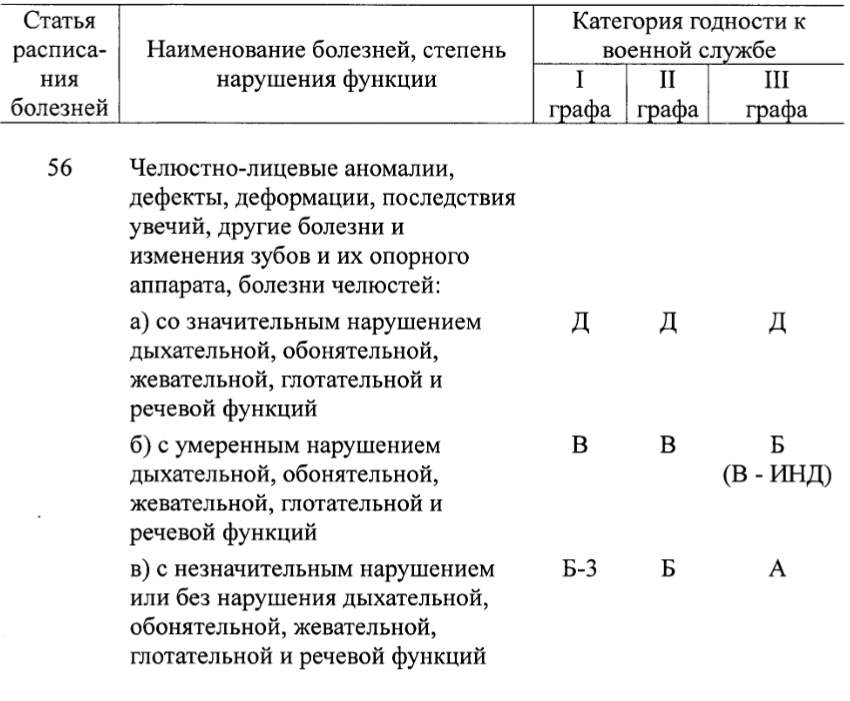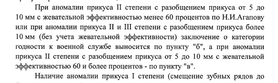 В п.56 болезней "челюстно-лицевые аномали..." есть диагноз, подходящий под категорию годности "В": аномалия прикуса 2 степени с разобщением от 5 до 10 мм и жевательной эффективностью не более 60% по Н.И. Агапову.