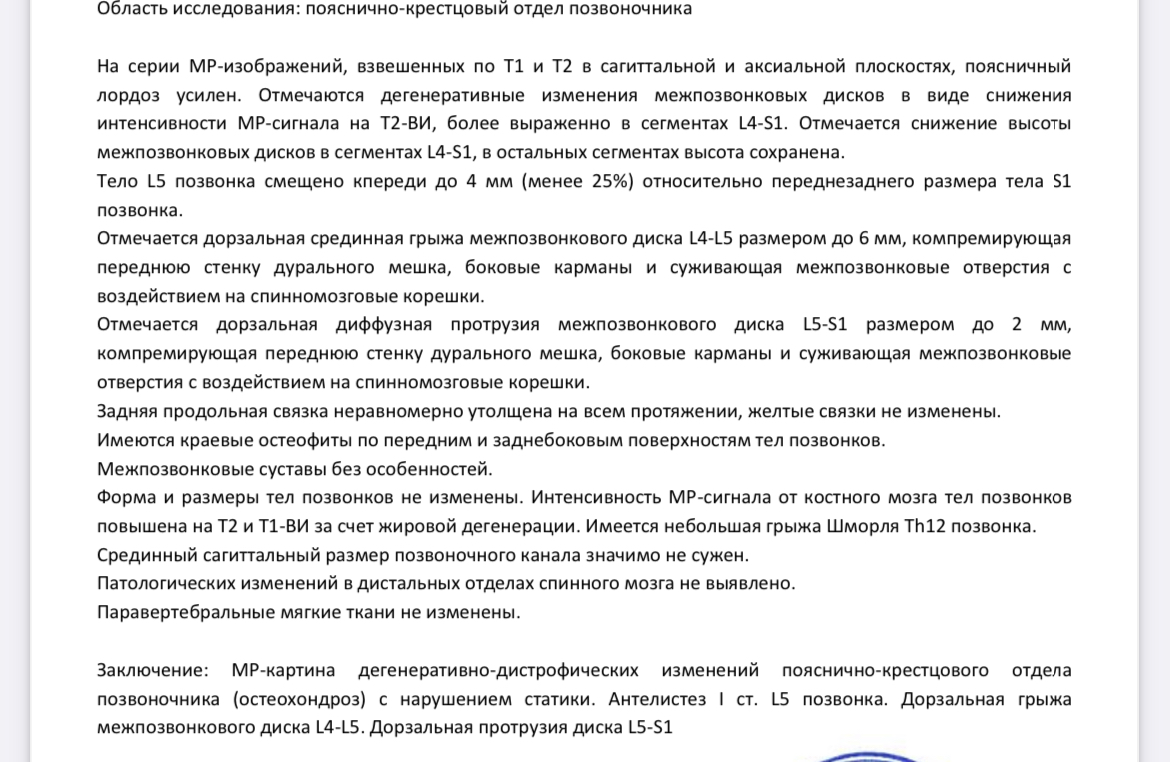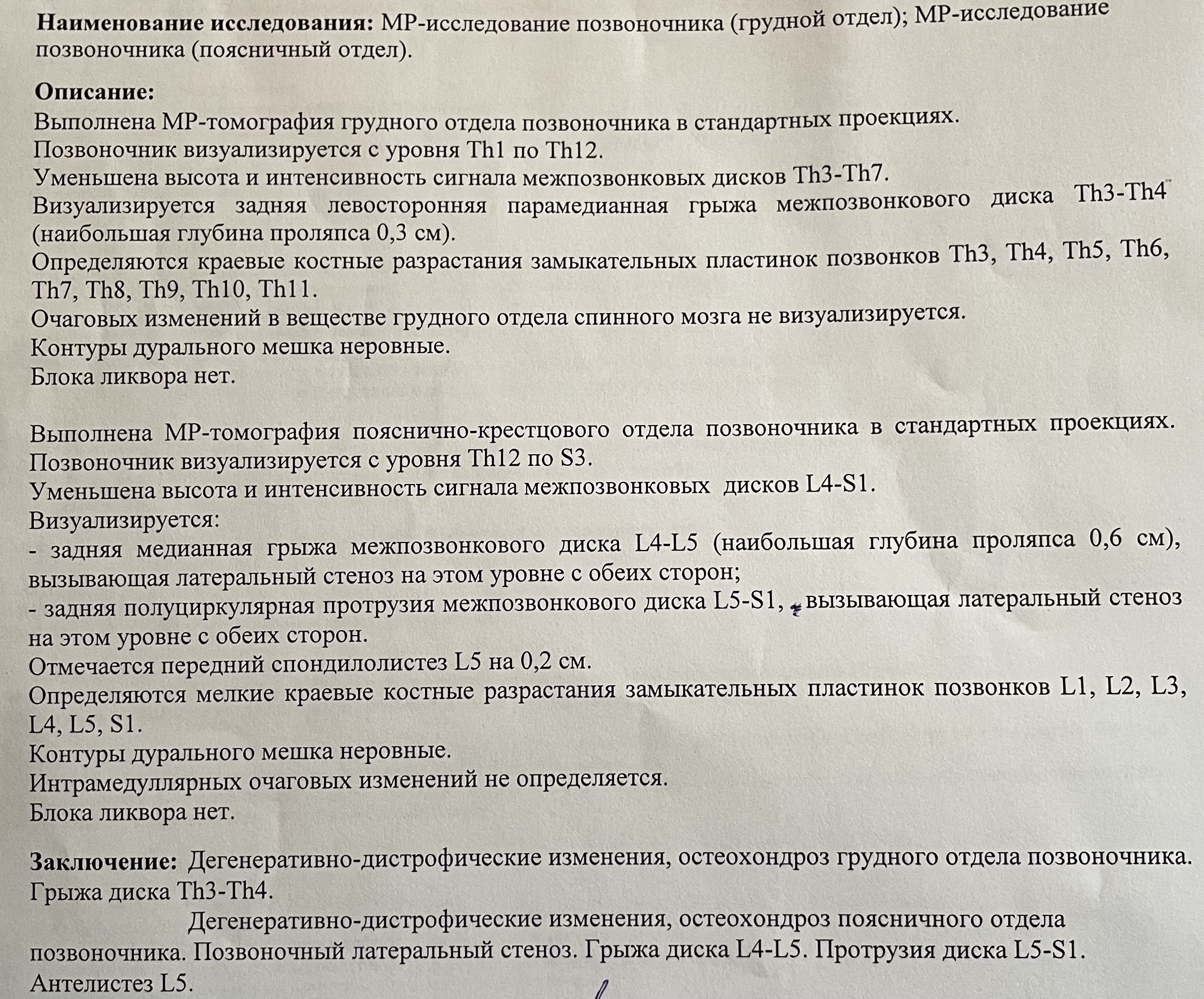 Mrwizard901 писал(а):Добрый день! В дополнение к теме. На данный момент имеется: в марте-апреле посещение травматолога-ортопеда (выше в теме); с мая по август 3 раза был у невролога по месту жительства с жалобами на боль в спине, невролог во всех трех случаях писал примерно одно и то же - люмбоишалгия, люмбаго; сделал МРТ снова по направлению невролога, съездил на прием к неврологу, получил такое заключение (прикрепляю)