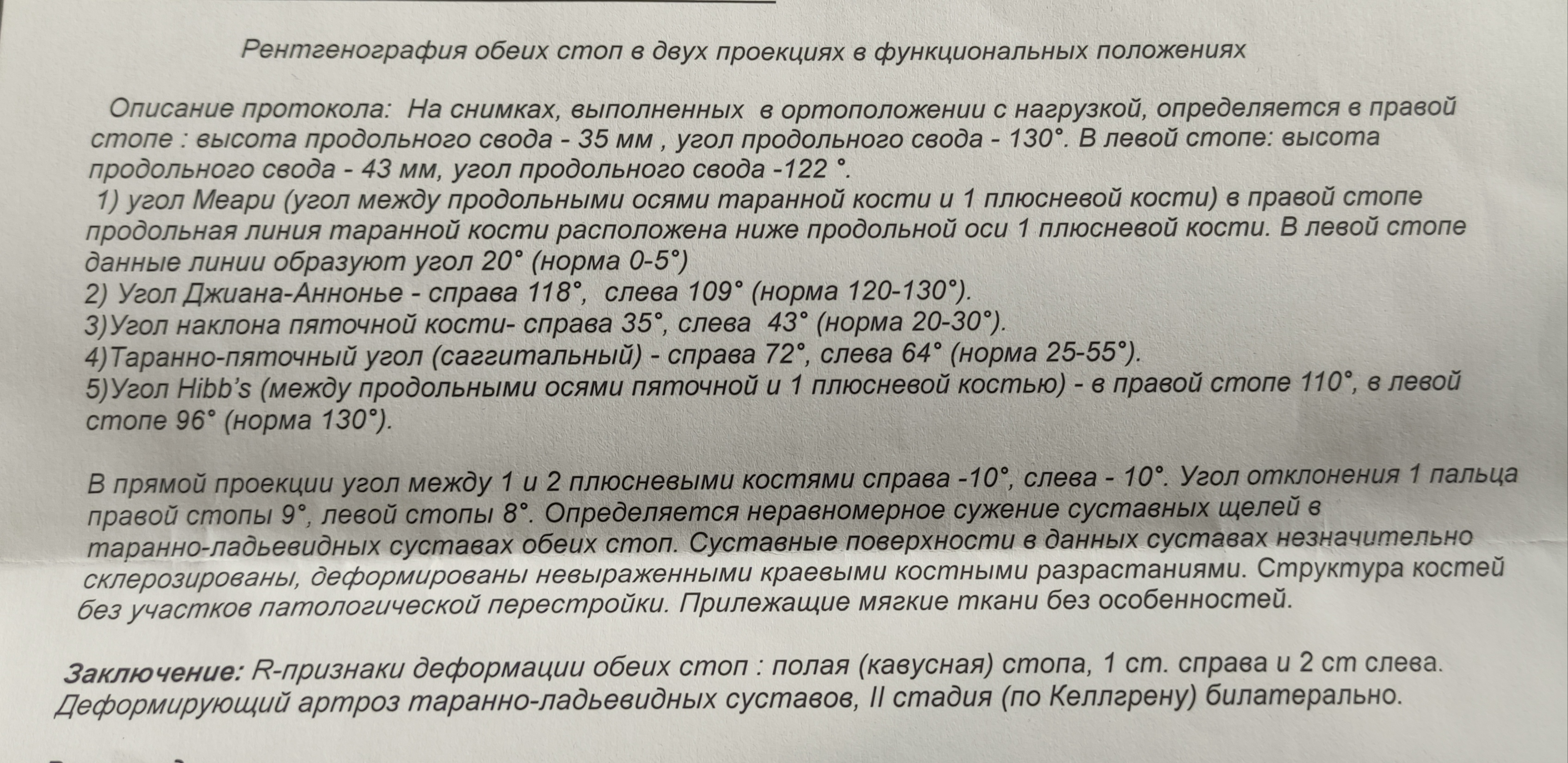 Уже в 15 лет у меня была диагностирована полая стопа и сколиоз 1 степени, но с того момента к ортопеду больше не ходил. Решать вопрос с армией я начал поздно, тем не менее, все же надеюсь на благоприятный исход. Три месяца назад приходил к своему ортопеду, он отказал мне в приеме и сказал возвращаться с направлением от хирурга из военкомата. Я поступил наивно и глупо - стал ждать дня комиссии. Незадолго до его наступления мне объяснили, что если являюсь туда без диагноза, то меня там никто слушать не станет. Поэтому я как можно скорее пошел к ортопеду в частную клинику, сделал рентген стоп, грудного и поясничного отдела позвоночника. По итогу со спиной у меня всё не так плохо, так что не вижу смысла прикладывать заключение. Заключение рентгенологического исследования стоп прикладываю ниже.