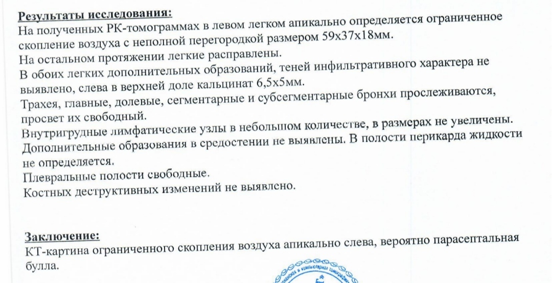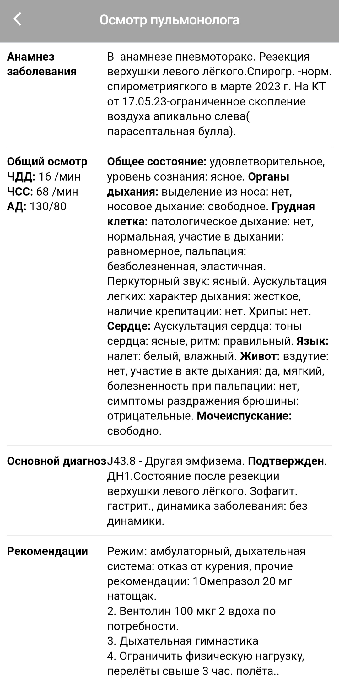 Здравствуйте.13 марта этого года произошел спонтанный пневмоторакс.В больнице была проведена Атипичная резекция верхней доли левого лёгкого в связи с обнаружением буллы.В данный момент прохожу дополнительное обследование от военкомата ,в направление указано "оценить состояние после операции на верхней доле левого лёгкого.Парасептальная эмфизема"