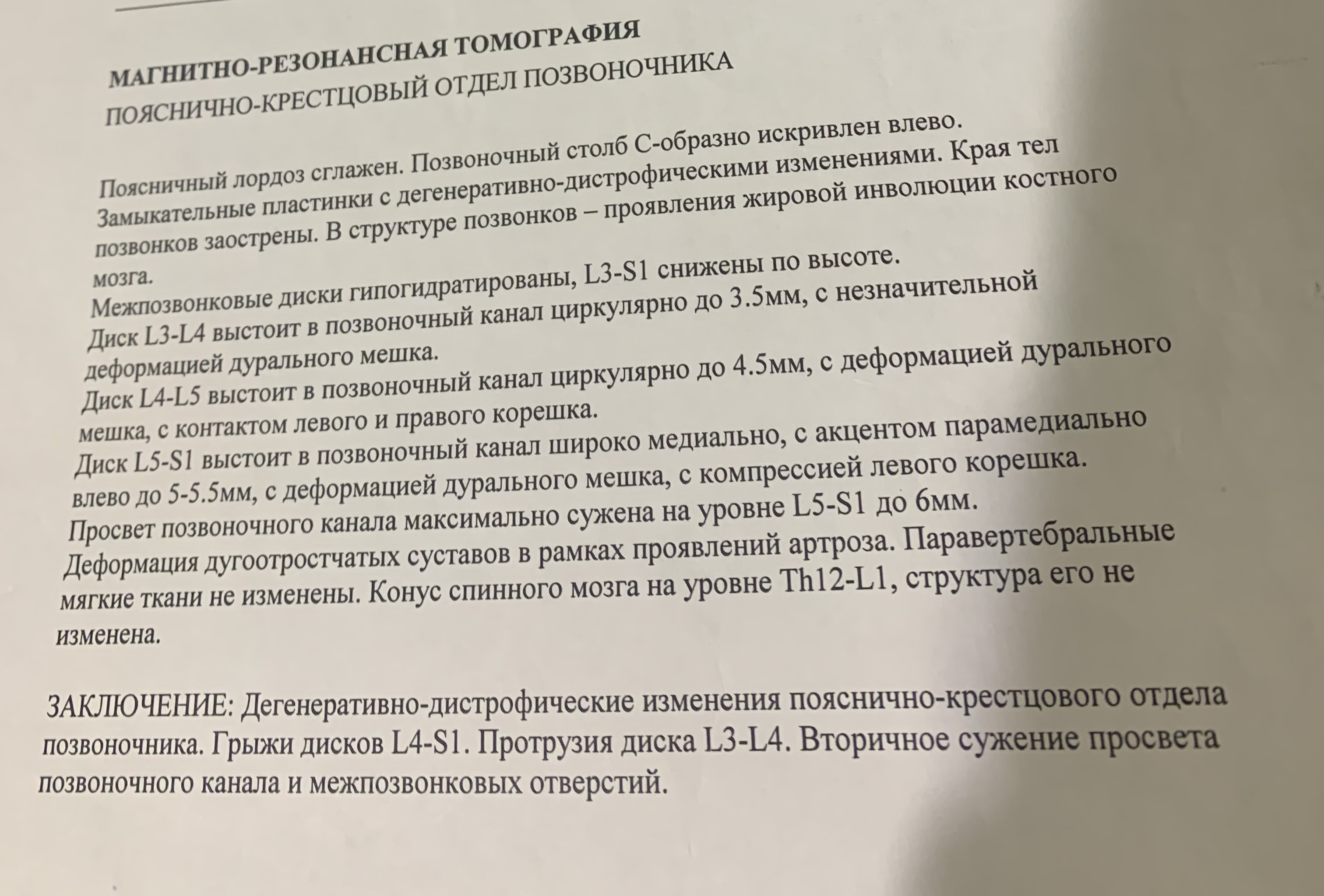 Дегеративно-дистрофические изменения пояснично-крестцового отдела позвоночника.Грыжи дисков L4-S1.Протрущия дискаL3-L4.Вторичное сужение просвета позвоночного канала и межпозвонковых отверстий