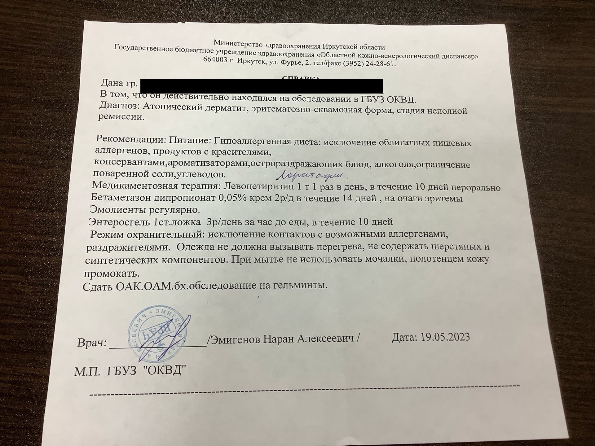 Спустя полгода в ОКВД дерматолог сделал свежую справку с тем же диагнозом, что и раньше и посоветовал снова обратиться к аллергологу. Аллерголог поставил диагноз: "Атопический дерматит, распространенная очаговая эритемасквамозная форма, легкое непрерывно рецидивирующее течение".