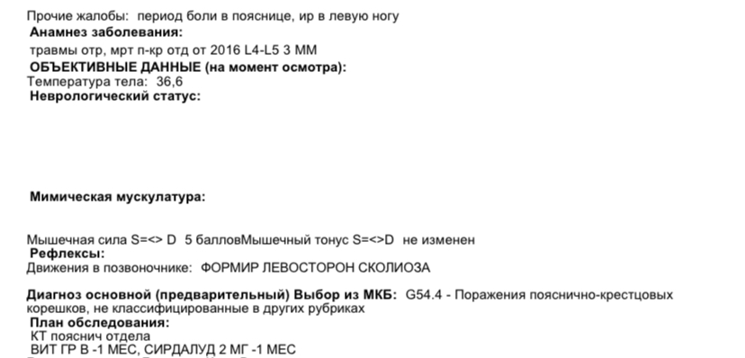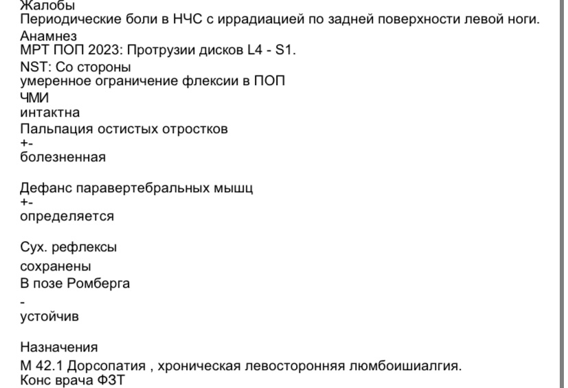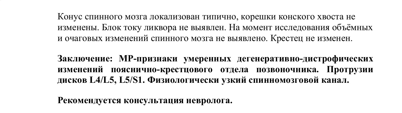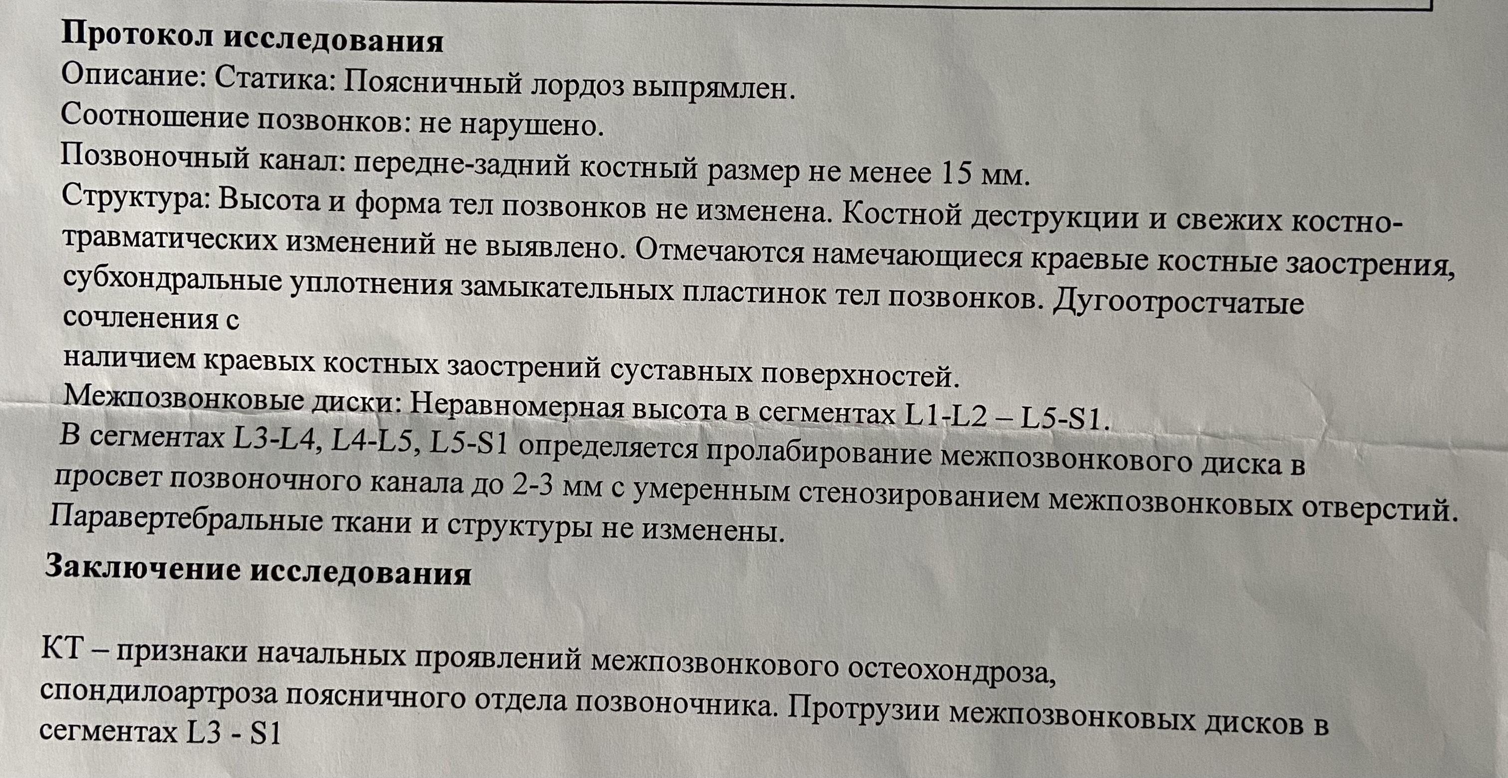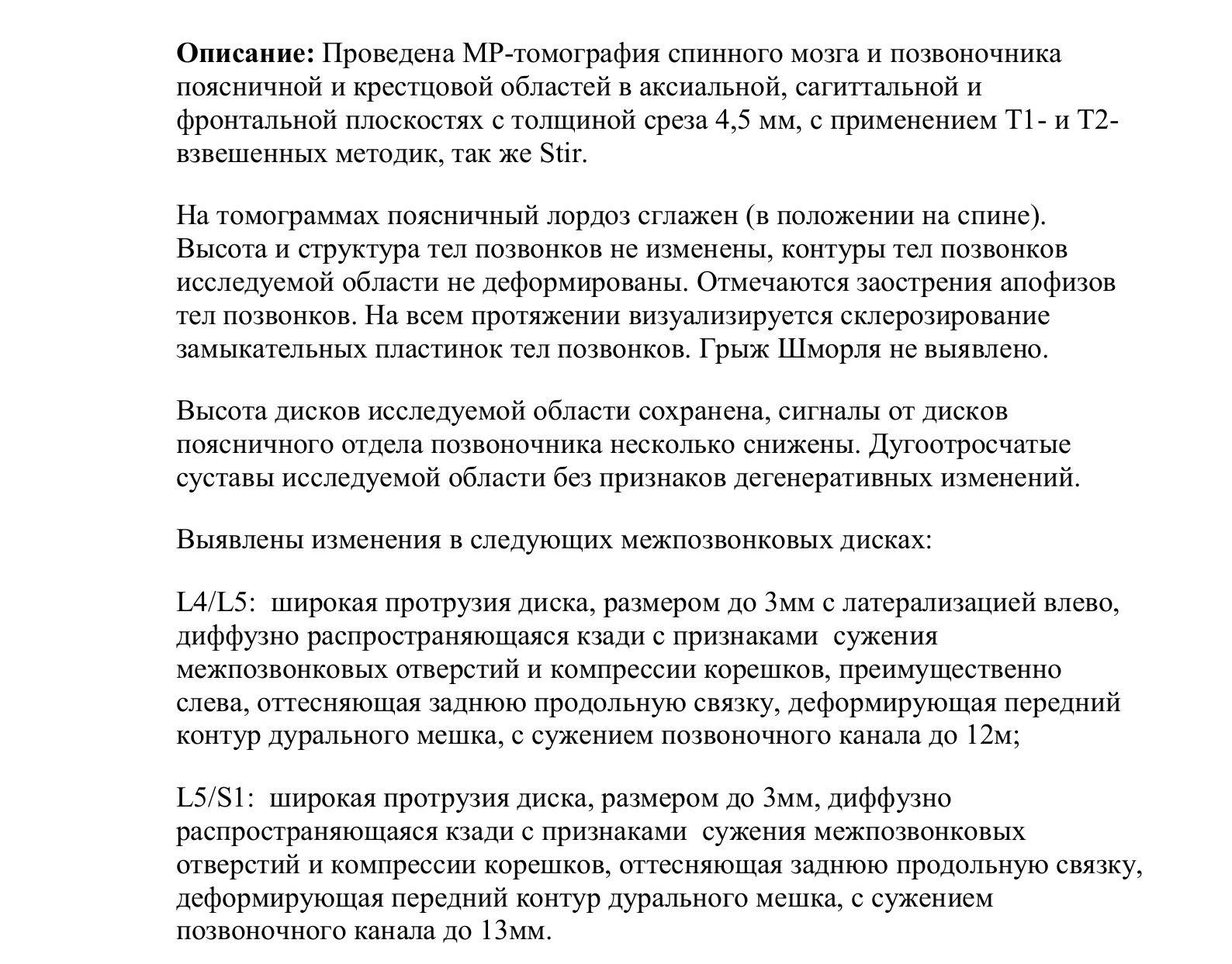 В конце марта этого года был на приёме у невролога с жалобами на боль в пояснице, иррадиирующей в левую ягодицу и ногу по задней поверхности бедра. Так же в этих зонах снижена чувствительность по сравнению с правой стороной. Невролог отправил меня на КТ пояснично-крестцового отдела (результат прикрепляю) и поставила диагноз «G54.4 Поражения поясничнокрестцовых корешков, не классифицированные в других рубриках». Назначила лечение в виде витаминов, миорелаксантов и нпвп. Боль немного стихла, но не ушла окончательно, чувствительность не улучшилась.