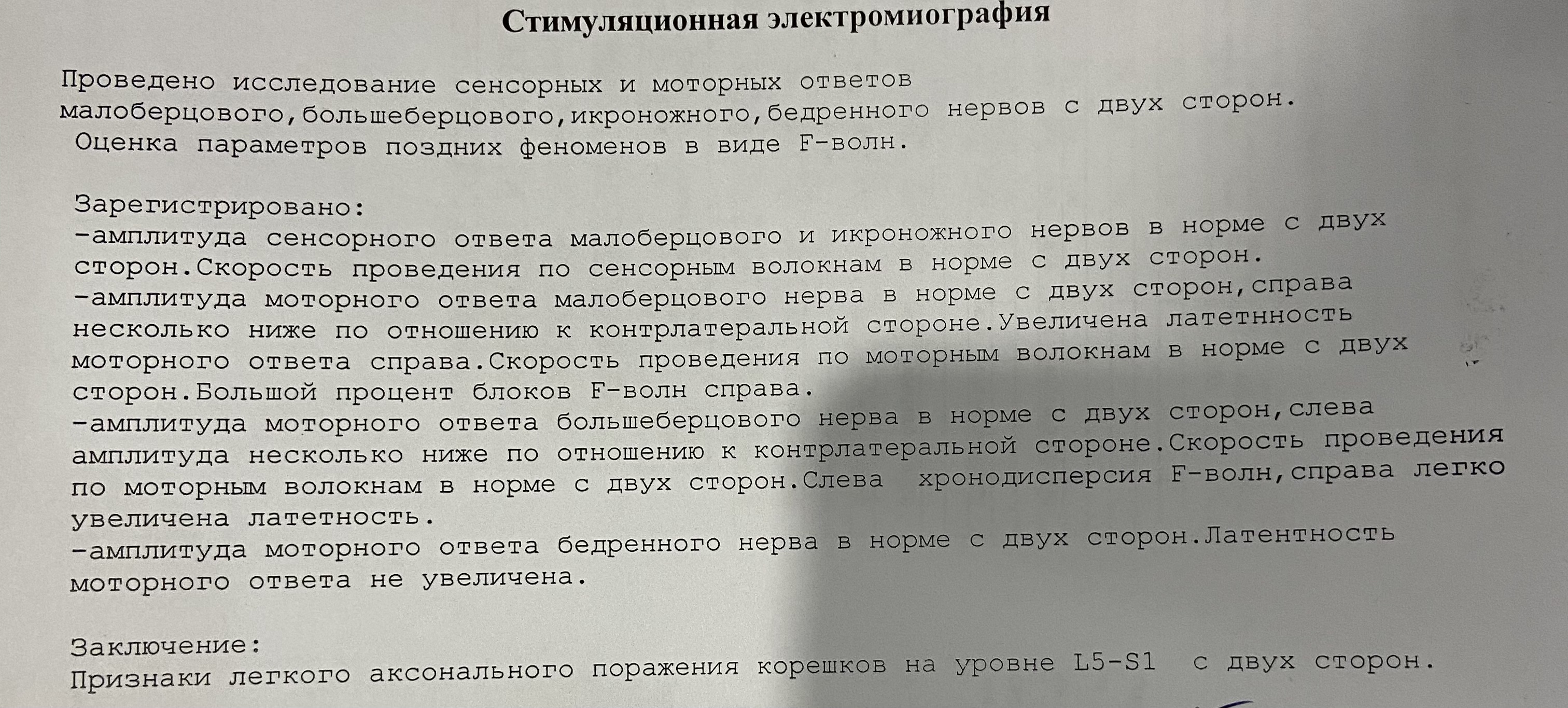 Далее уже в июле этого года, снова усилились боли. Сделал стимуляционную ЭНМГ нижних конечностей (результат также прикрепляю). Снова пошёл к неврологу. Он предложил походить в дневной стационар. Я согласился и сейчас как раз к этому готовлюсь.Направление невролог дал с тем же диагнозом. И ещё стал расспрашивать не связаны ли мои обращения с призывом, потому как ничего серьезного по результатам анализов нет и сильно болеть не может.