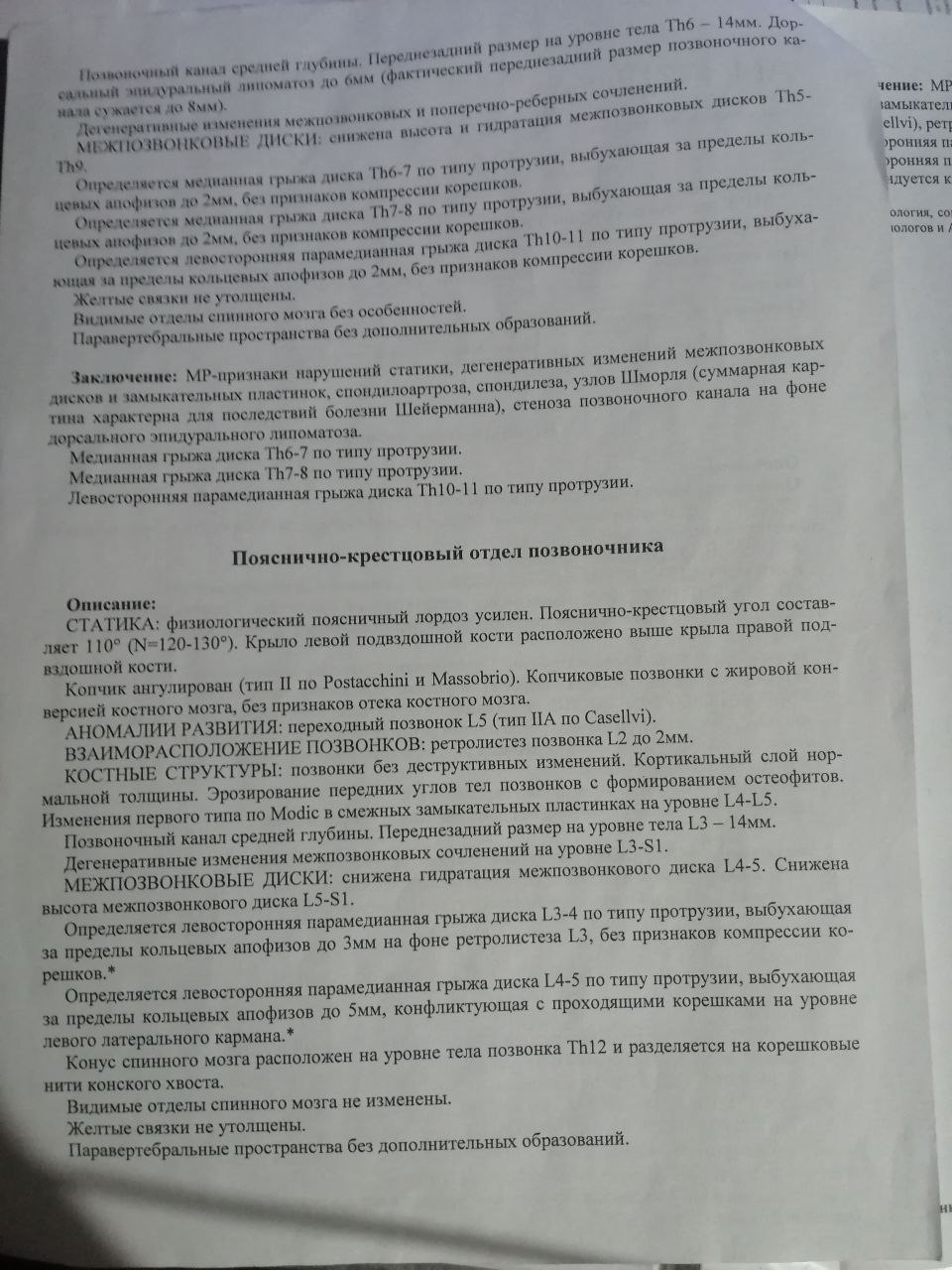 По результатам моего МРТ можно понять, что в шейном у меня спондилез (С4-С6), грудном отделе тоже спондилез, но не указаны какие именно позвонки(возможно, что все позвонки с формированием остеофитов, поэтому рентгенолог не стал писать какие именно позвонки поражены).И Поясничный отдел тоже с спондилезом, и тут тоже не указаны какие именно позвонки поражены.