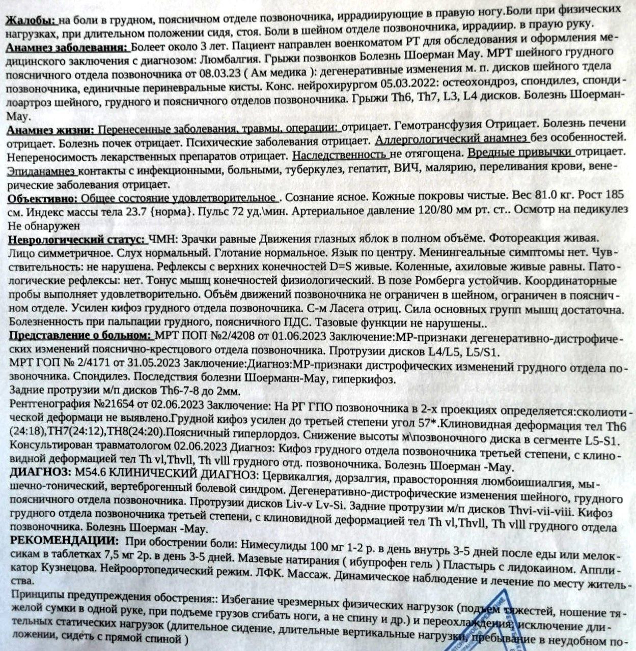 Сагиров писал(а):Не могли бы Вы дать совет. Как, хотя бы косвенно, разговором, повлиять на то, чтобы врач сформулировал диагноз примерно так, чтобы он подходил под формулировку расп. болезней. У меня некоторые проблемы в этом плане. Ведь по факту у меня все имеется для статьи 66 пункта В, основная проблема в формулировке диагноза. Не хотелось бы спорить с врачом. Понимаю, что вы не психолог, но любой совет будет для меня полезен.
