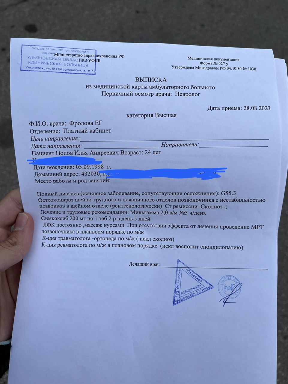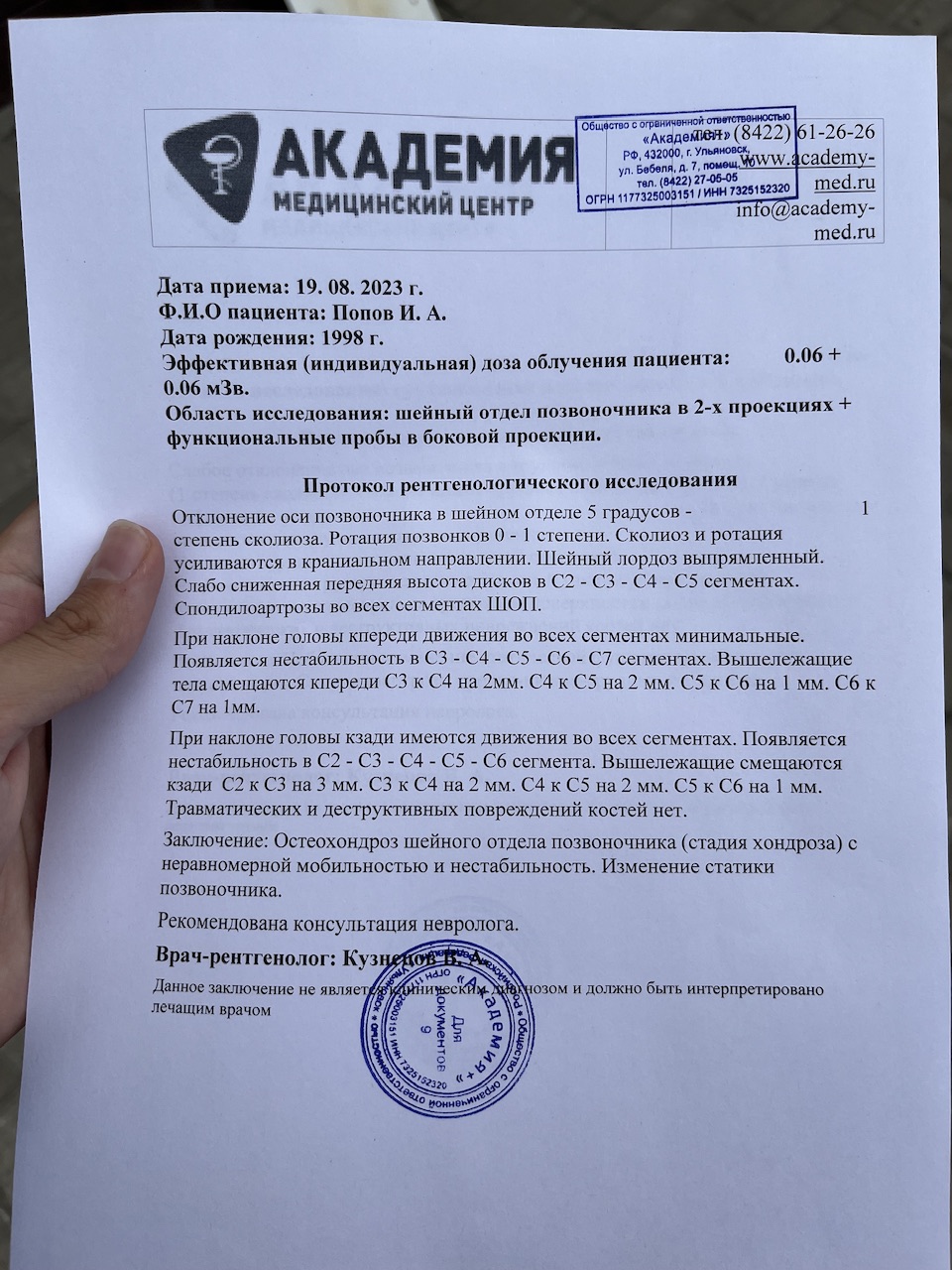 С этим заключением пошел в государственную клинику к неврологу. Данный невролог мне поставил диагноз «Остеохондроз шейного, поясничного и грудного отдела позвоночника. Нестабильность шейного отдела».