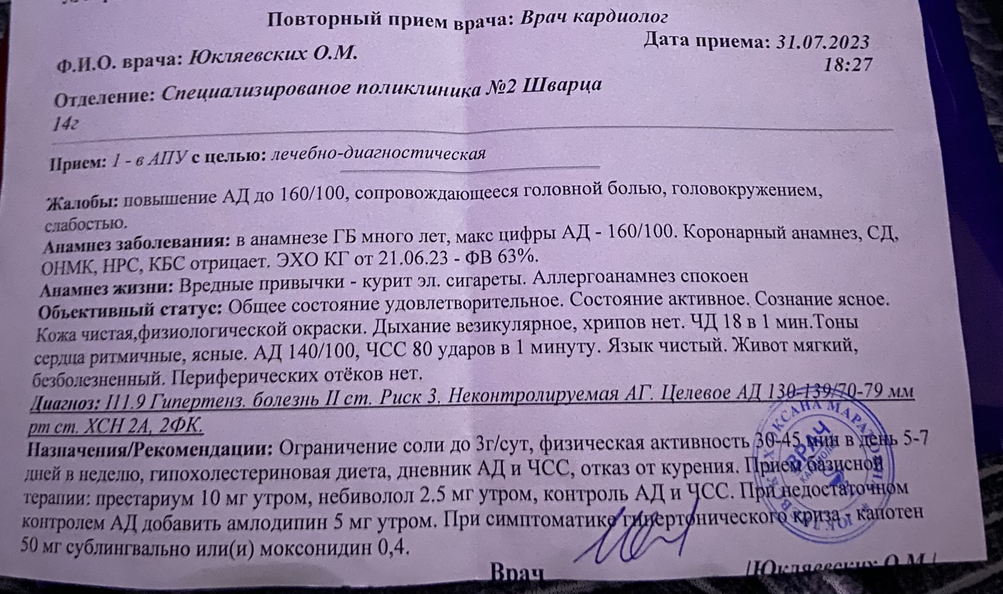 Семен467 писал(а):Здравствуйте, поставили диагноз «11 1.9 Гипертенз. Болезнь 2 стадии, риск 3. Неконтролируемая АГ. Целовок АД 130-139 70/79. ХСН 2А, 2ФК».