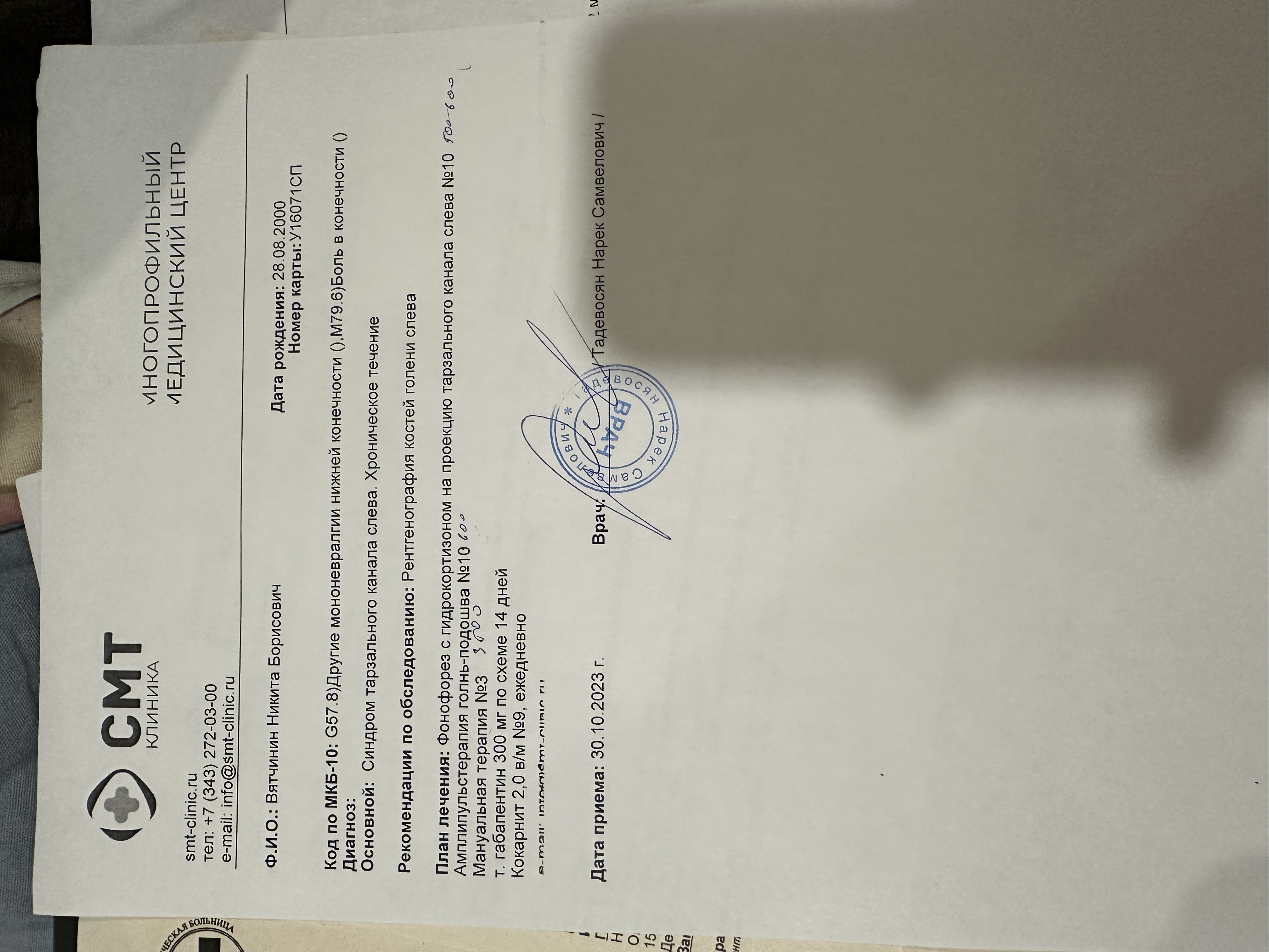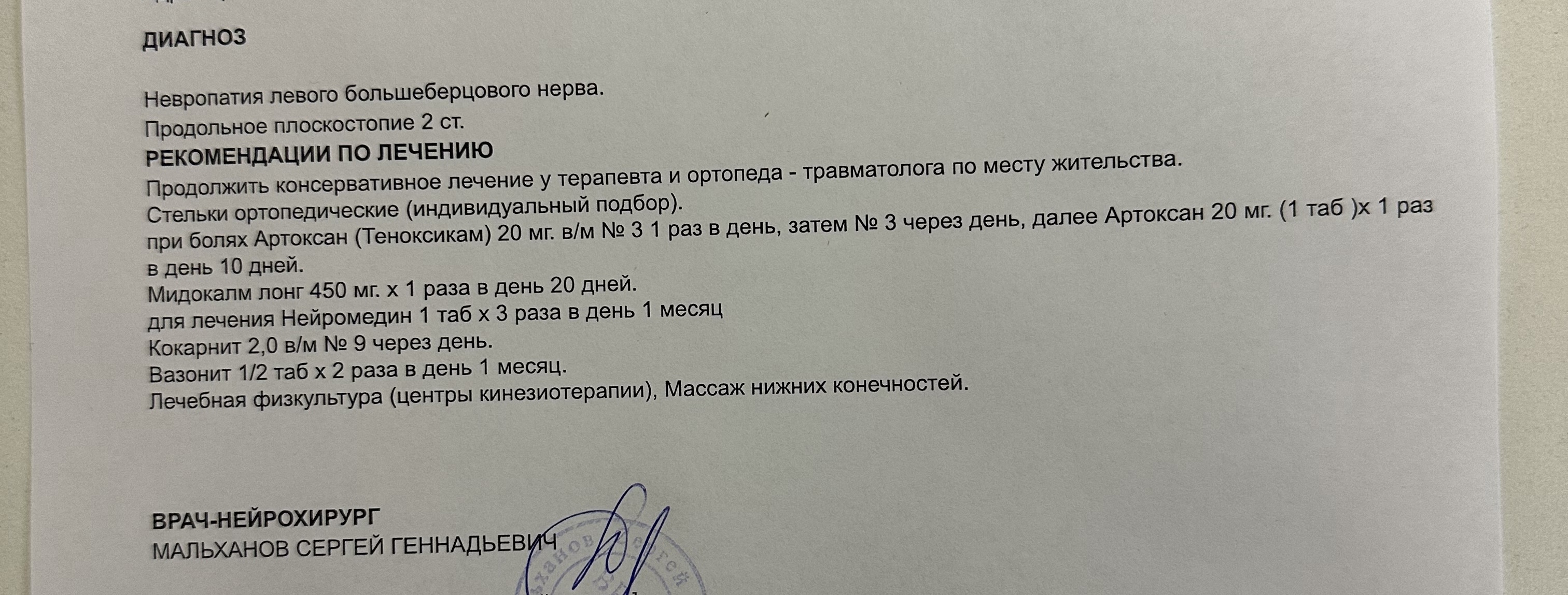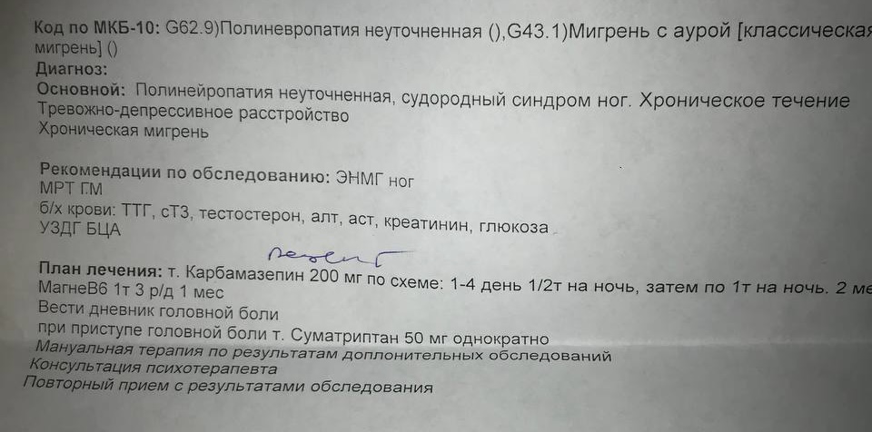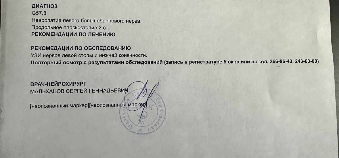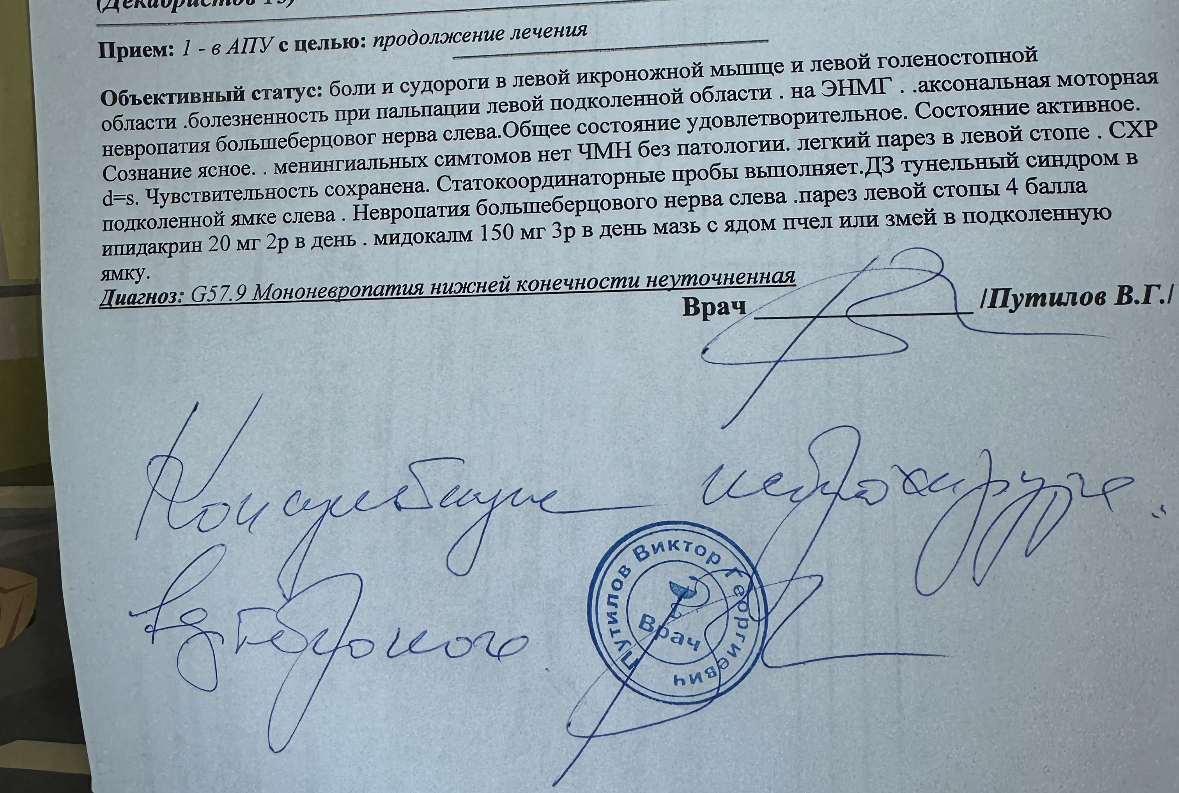 сказал в первую очередь сделать ренгтен большеберцовой кости, чтобы исключить новообразование. Выписал план лечения на первое время и назначил повторный прием через 2-3 недели. Предварительно поставил синдром тарзального канала, но сказал что нужно удостовериться. Сказал что ситуация крайне странная, боль идет от одного нерва, плохо шевелятся пальцы от другого. Опрашивал есть ли в семье неврологические заболевания. Обьяснил мне, что есть крайне редкие неврологические заболевания, но он пока не готов говорить об этом диагнозе, предложил сначала проверить успешность назначенное лечение.