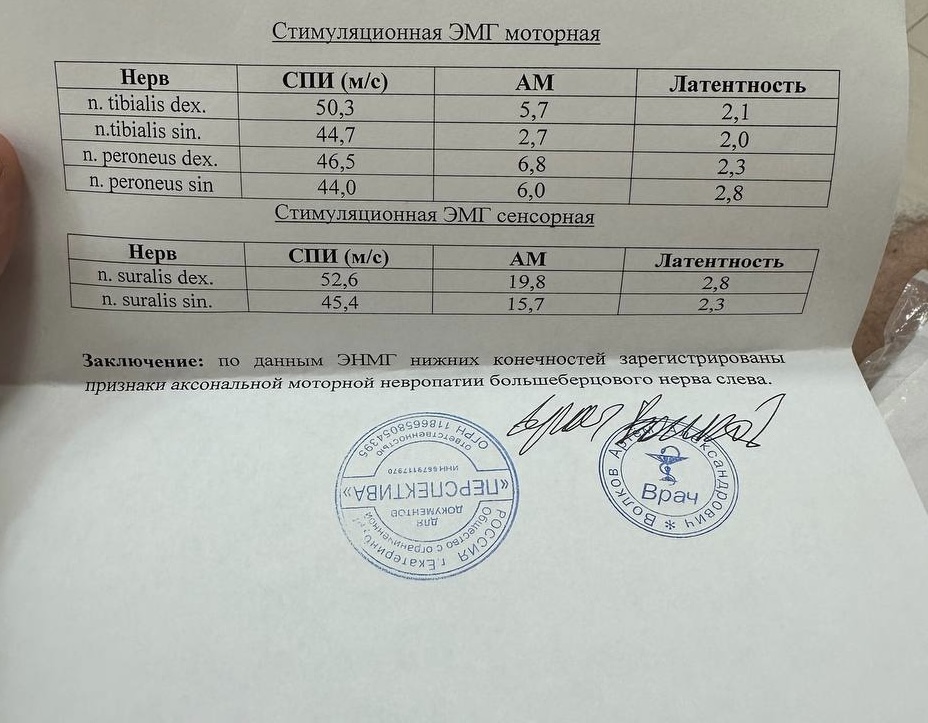 Nikita J писал(а):Частный невролог обнаружил в апреле полиневропатию неподтвержденную на основании осмотра, дальше ЭНМГ показало аксонально-моторную невропатию большеберцового нерва слева, попал к неврологу с жалобами на постоянную боль в стопе и ноге и частично не шевелятся пальцы, невролог диагностировал туннельный синдром слева и парез стопы 4 балла, отправил к нейрохирургу, так как сказал может встать вопрос о защемлении и операции . Попал к нейрохирургу, он направил на узи нервов нижней конечности, узи не нашло никаких патологий нерва, после чего он просто диагностировал как естт невропатию большеберцового нерва и плоскостопие 2ст, направил дальше к ортопеду. На данный момент спустя 2 месяца боли никуда не ушли, начала болеть уже правая нога в подколенной области, при ходьбе сводит икру, пальцы все так же на левой стопе почти не шевелятся. Впереди поход к ортопеду и повторный в военкомат. Могу рассчитывать на категорию В? Может ли быть невропатия из-за развивающегося плоскостопия?
