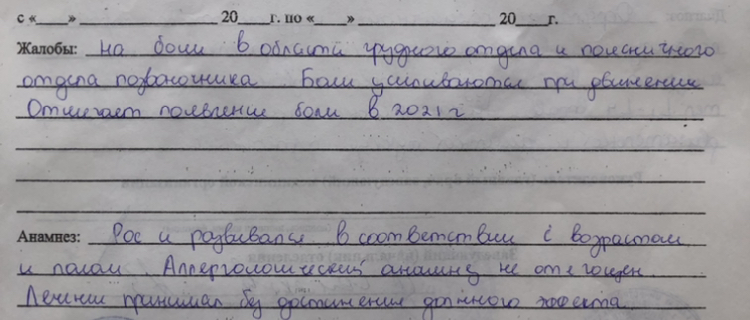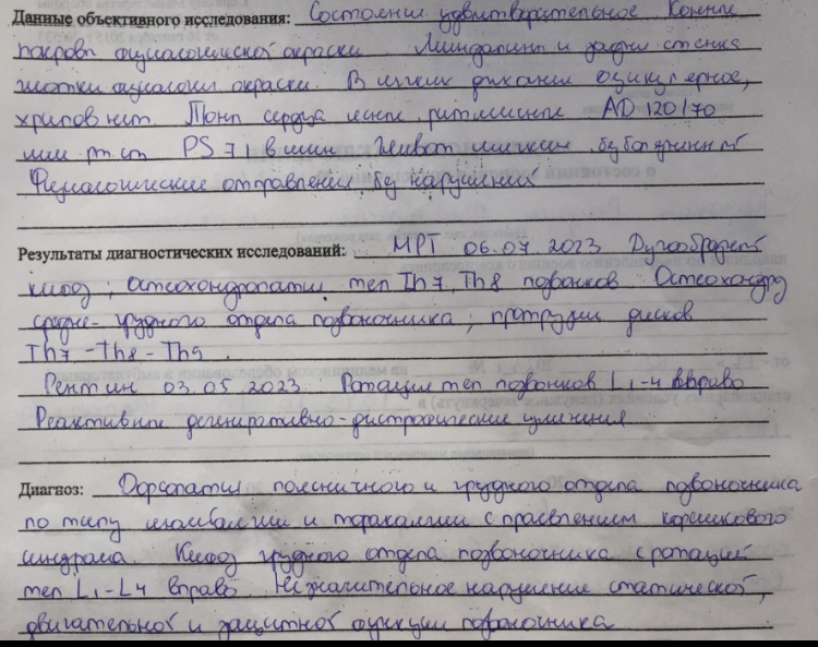 Имею сильные боли в грудном и пояснично-крестцовом отделах позвоночника, вследствие чего было много обращений к Терапевту-участковому, который назначал разные методы лечения (Медикаменты, Электрофорез, ДДТ), но они не принесли результата.