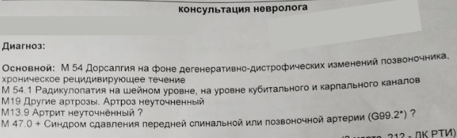 Диагноз: М54 Дорсалгия на фоне дегенеративно-дистрофических изменений позвоночника, хроническое рецидивирующее течение. М54.1 Радикулопатия на шейном уровне, на уровне кубитального и карпального каналов. М13.9 Артрит неуточненный. Синдром кубитального и карпального каналов. М47.0 Синдром сдавления передней спинальной или позвоночной артерии (видимо, неуточнено, стоит знак вопроса).