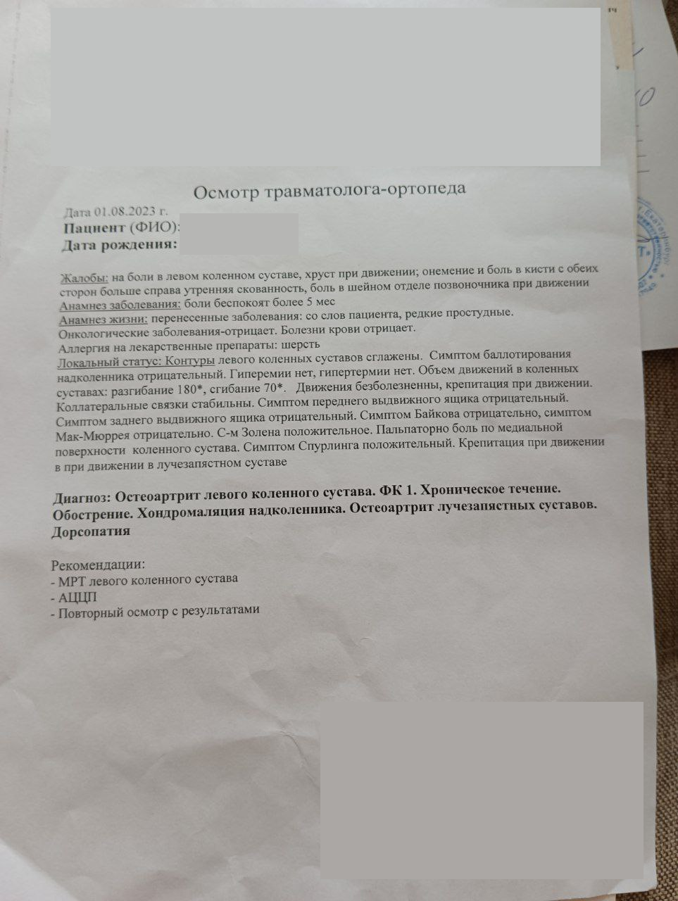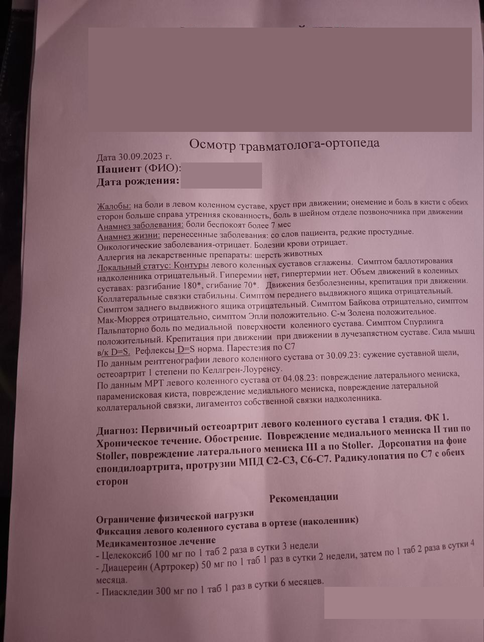 Диагноз: Первичный остеоартрит левого коленного сустава 1 стадия. ФК1. Хроническое!!! течение. Обострение. Повреждение медиального мениска 2 тип по Stoller, повреждение латерального мениска 3 а по Stoller. Дорсопатия на фоне спондилоартрита, протрузии МПД С2-С3, С6-С7. Радикулопатия по С7 с обеих сторон. Хондромаляция надколенника. Остеоартрит лучезапястных суставов