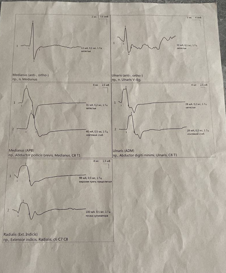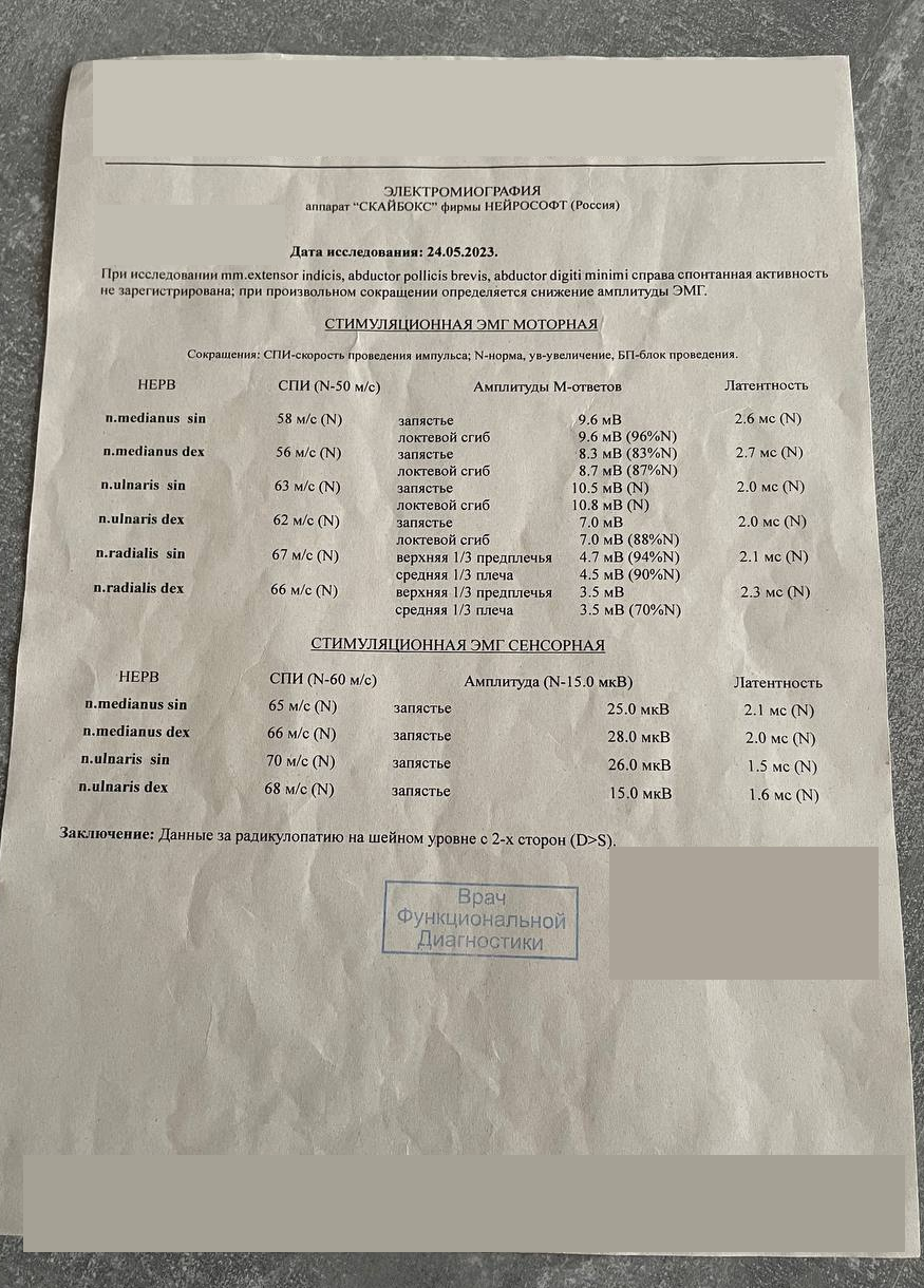 Также добавлю, что есть результаты ЭНМГ, где видны отклонения, которые подтверждают шейную радикулопатию с двух сторон