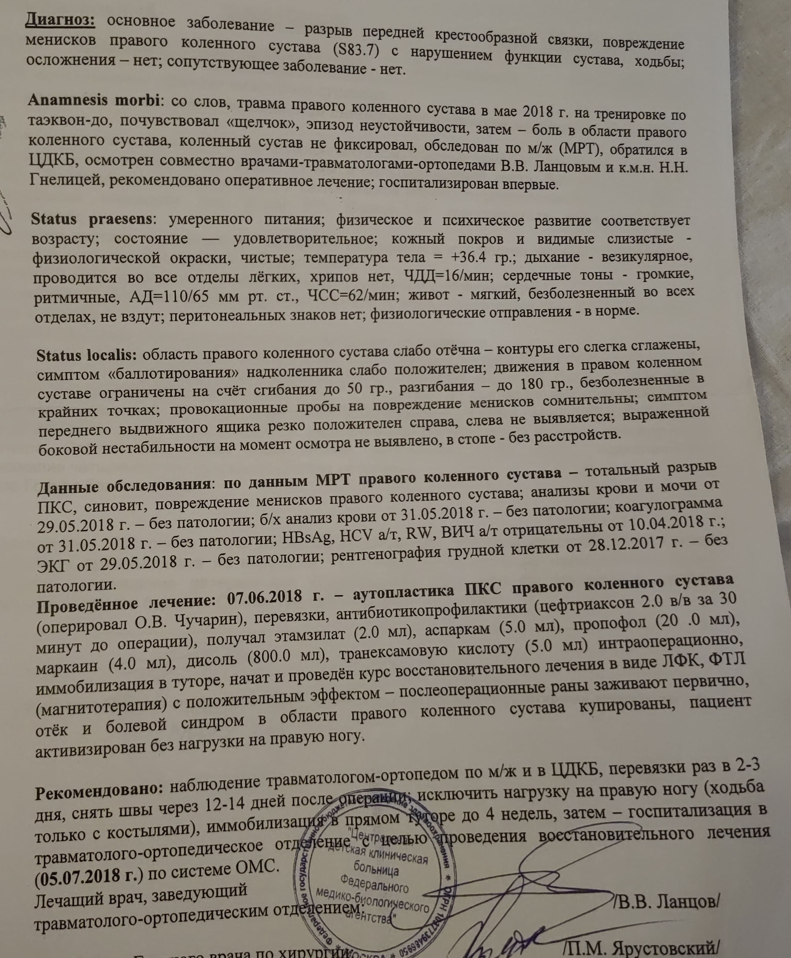 Был диагноз: Разрыв ПКС, повреждение менисков с нарушением функции сустава, ходьбы. Выполнил аутопластику ПКС. Фото приложил.