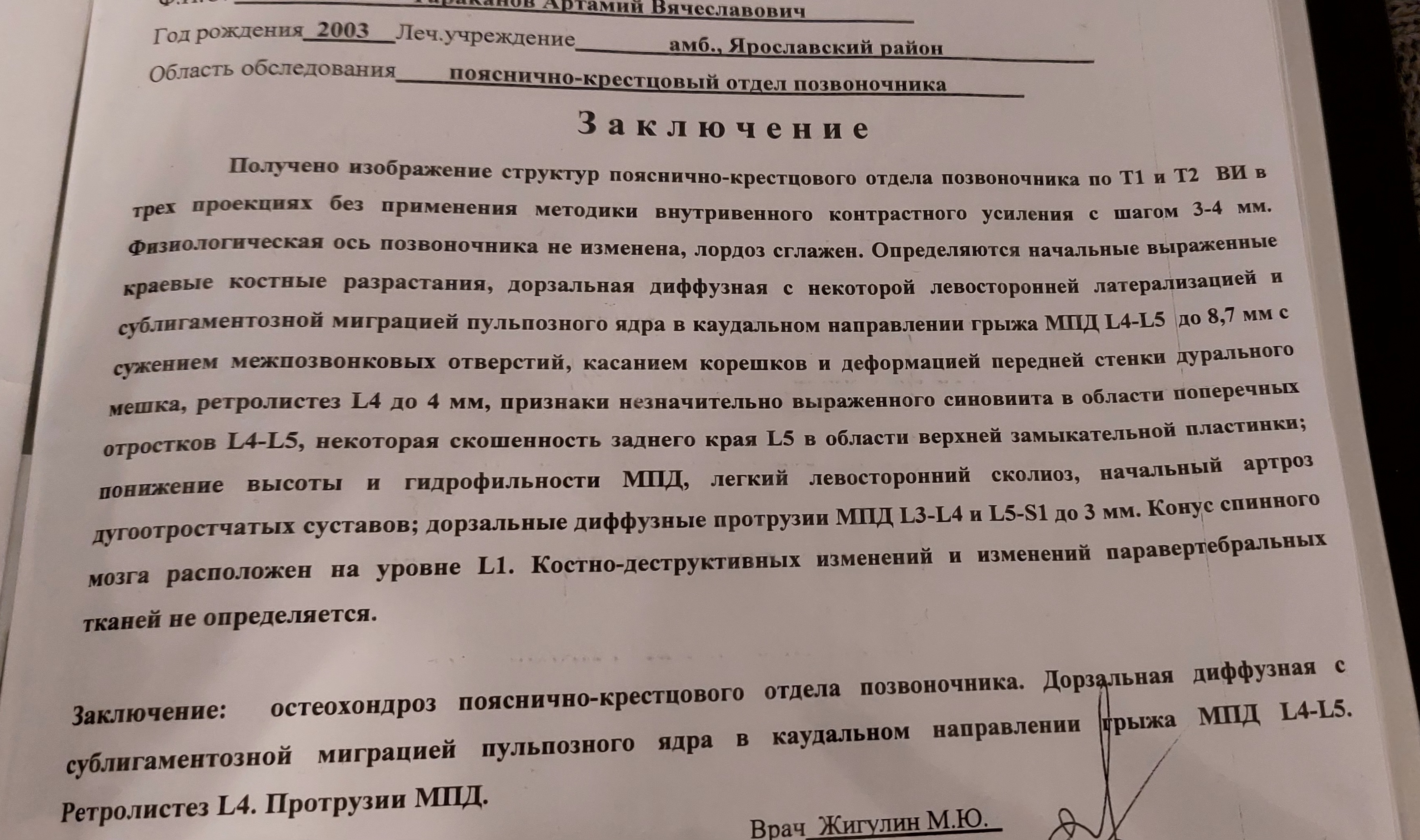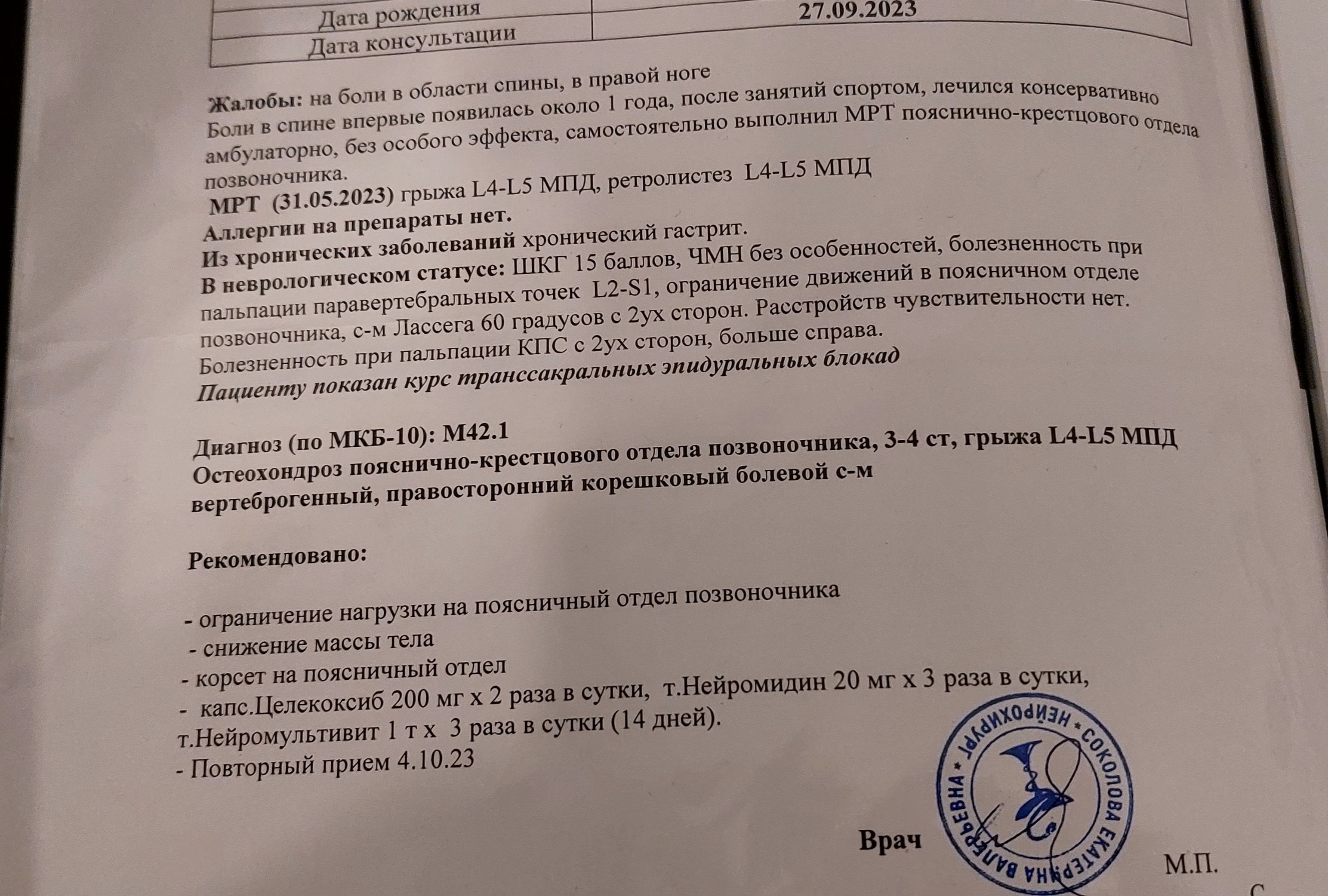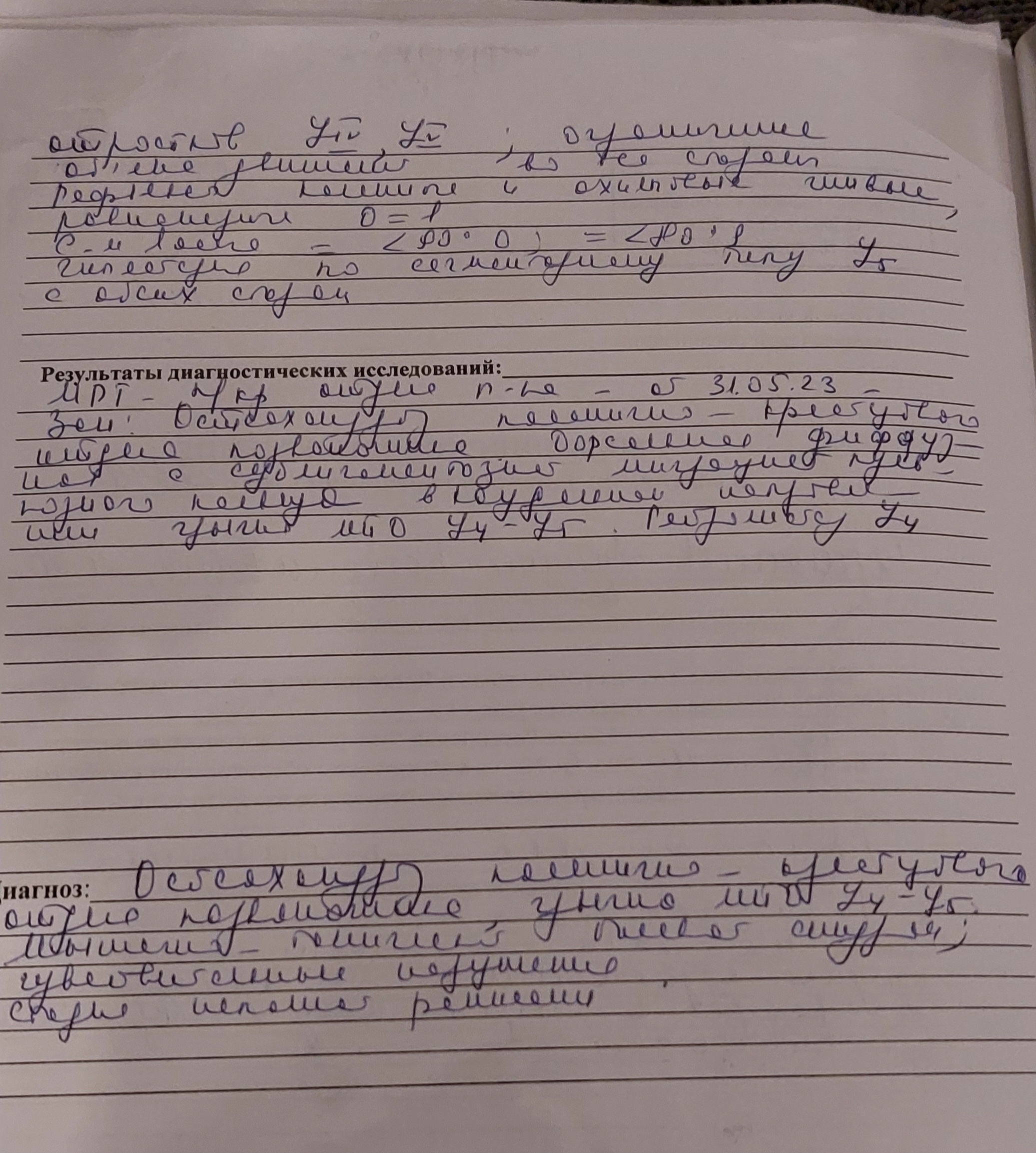Диагноз: остеохондроз пояснично-крестцового отдела позвоночника, грыжа мпд L4-L5, Мышечно-тонический болевой синдром, чувствительность нарушена.