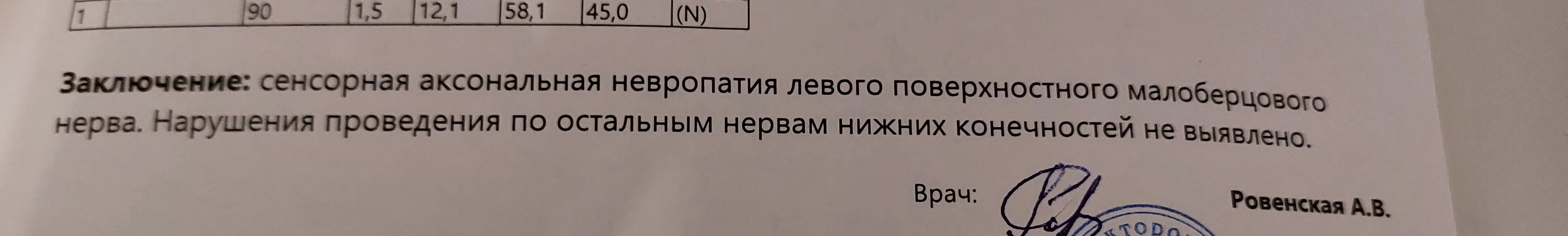 По энмг : сенсорная аксональная невропатия левого поверхностного малоберцового нерва. Нарушения по остальным нервам нижних конечностей не выявлено