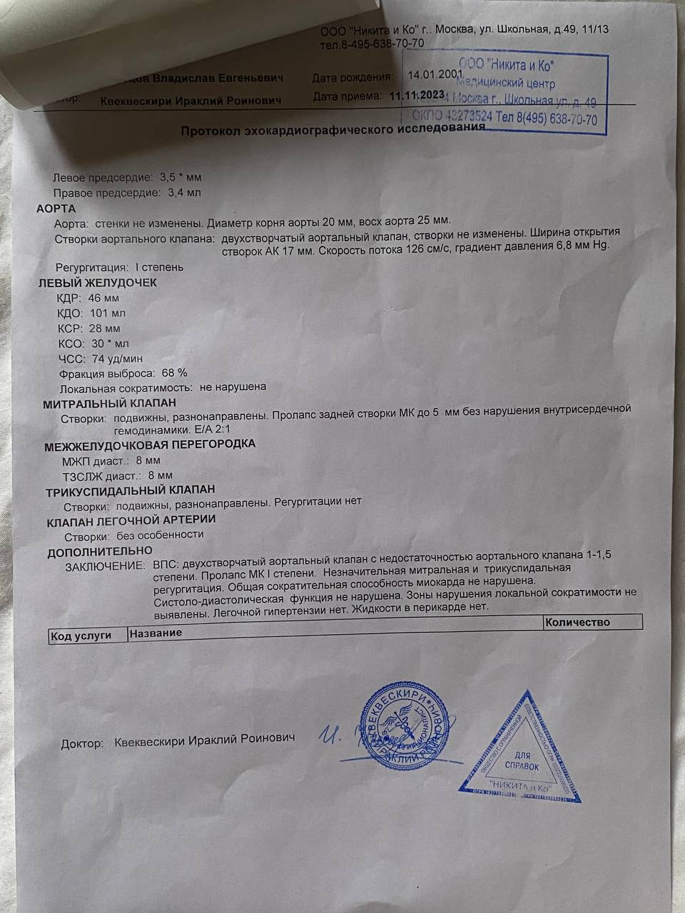 Mirkwood писал(а):Добрый день! С 13 лет поставлен диагноз "ВПС: двустворчатый аортальный клапан, недостаточность АК (регургитация) 0-1 степени", все записи с детской поликлиники сохранены. По новому заключению ЭХОКГ диагноз подтвердился, но недостаточность АК 1-1,5 степени (указано, что регургитация I степени), фото прилагаю. Помогите, пожалуйста: если есть минимальные признаки недостаточности/регургитации, в праве ли мне дать категорию "Б4"? Есть противоречивая информация по этому поводу: где-то пишут, что для категории "В" достаточно наличие самого факта регургитации (и неважно, какой степени), а в каких-то источниках указывают, что здесь для этого необходима регургитации от II степени, поскольку I степень "не представляет диагностической ценности". Сильно запутался и не понимаю, как действовать, заранее спасибо за ответ!