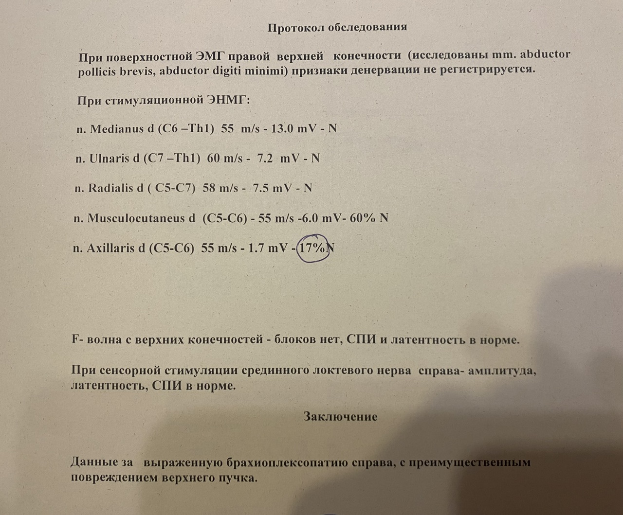 По энмг :Выраженная брахиоплексопатия справа, с преимущественным повреждением верхнего пучка.