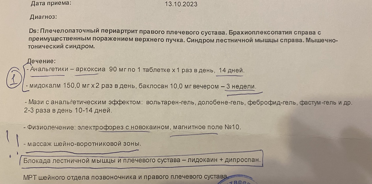 Диагноз: Плечелопаточный периартрит правого плечевого сустава. Брахиоплексопатия справа с преимущественным поражением верхнего пучка. Синдром лестничной мышцы справа. Мышечно-тонический синдром.
